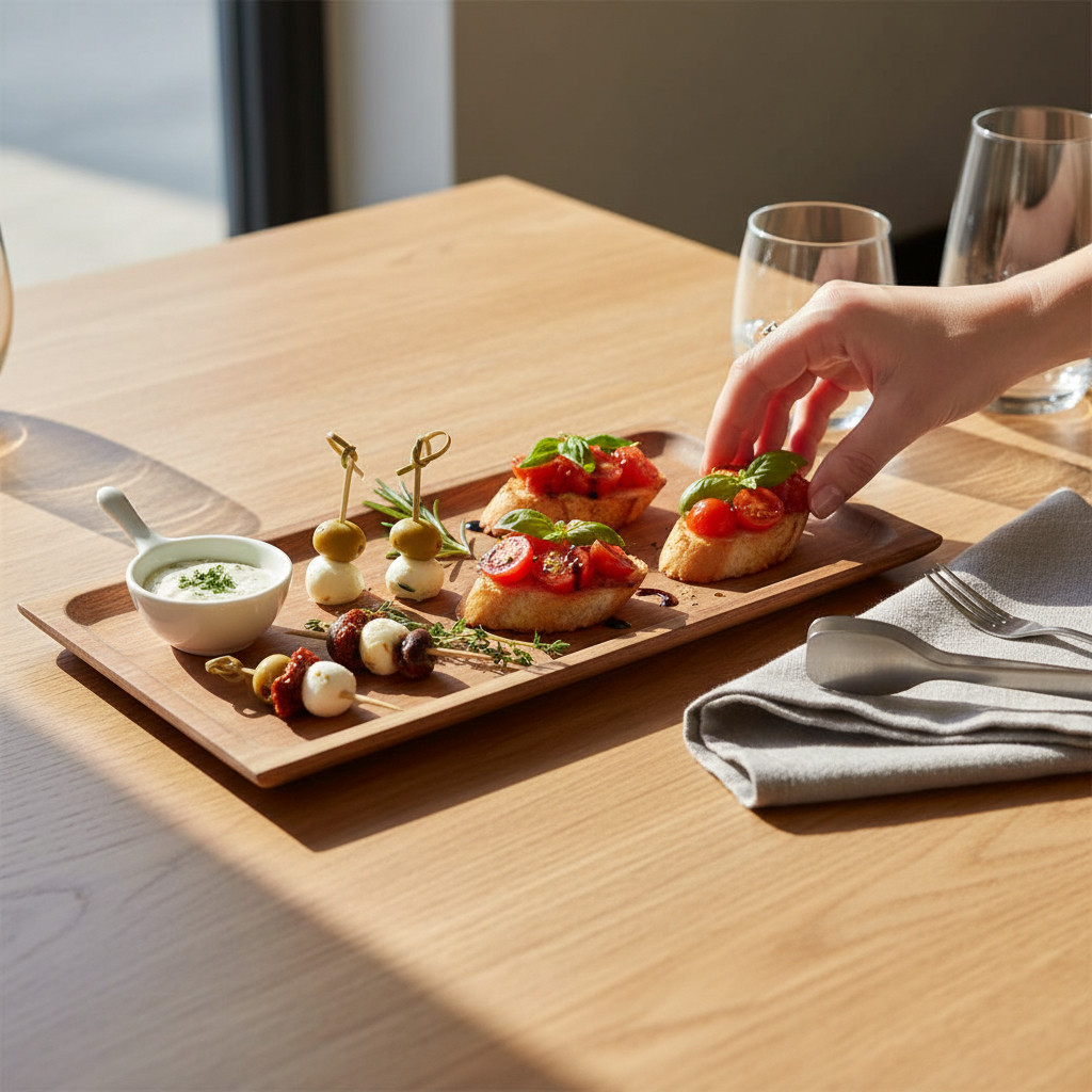 - Természetes megjelenés: a meleg tónusú akáciafa kiemeli az ételek színeit.