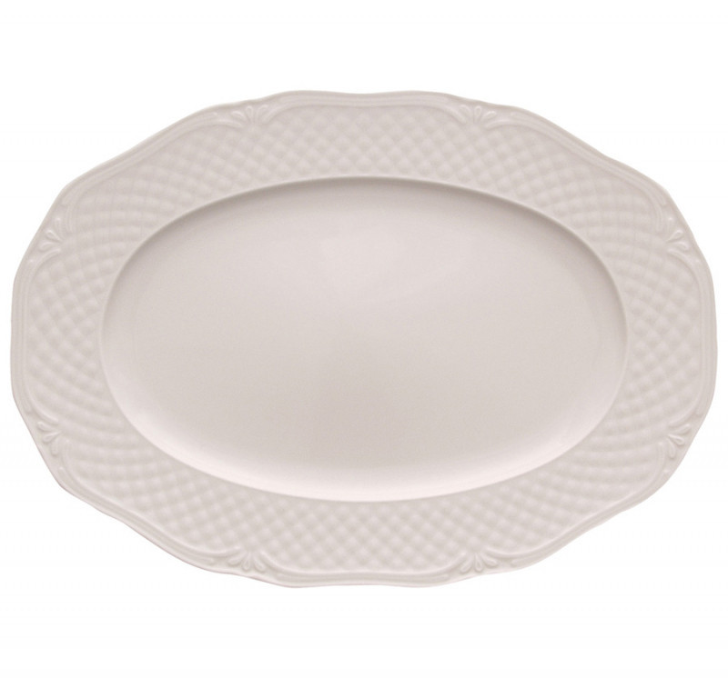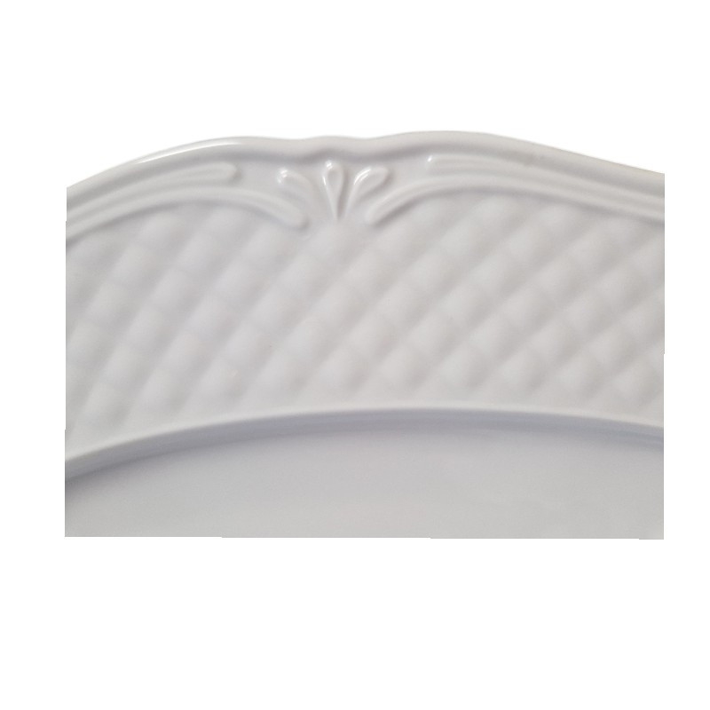 A sültestál legszembetűnőbb és egyedi jellemzője a peremén körbefutó finom, geometrikus minta. Ez a minta apró, egymást követő kockákból áll, amelyek négy sorban, diszkréten díszítik a tál szélét. Ez a visszafogott, mégis elegáns díszítés modern és letisztult megjelenést kölcsönöz a sültestálnak, ugyanakkor egyfajta klasszikus eleganciát is sugall. A minta nem hivalkodó, mégis vonzza a tekintetet, és hozzájárul az asztal elegáns megjelenéséhez. A minta finomsága és precizitása a porcelán magas minőségét tükrözi. A sima és fényes felület tovább fokozza a minta eleganciáját és kiemeli a porcelán fényét.