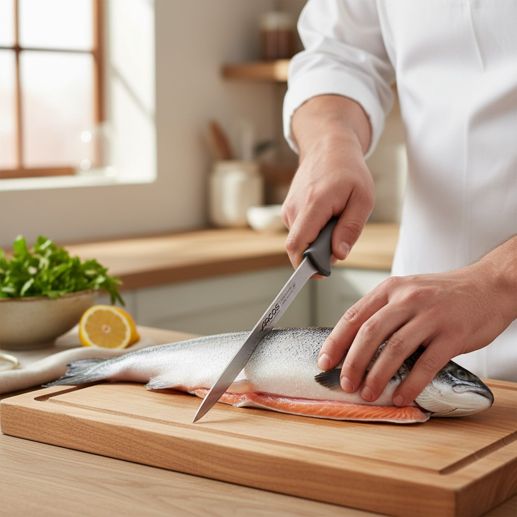 Az Arcos [Termékcsalád] filézőkés egy prémium minőségű, 20 cm-es pengéjű konyhai eszköz, amelyet kifejezetten a halak szakszerű és könnyed filézésére terveztek. A penge rugalmassága, a NITRUM® acél kiváló tulajdonságai és az ergonomikus markolat együttesen biztosítják a professzionális felhasználói élményt otthon és a vendéglátásban egyaránt.