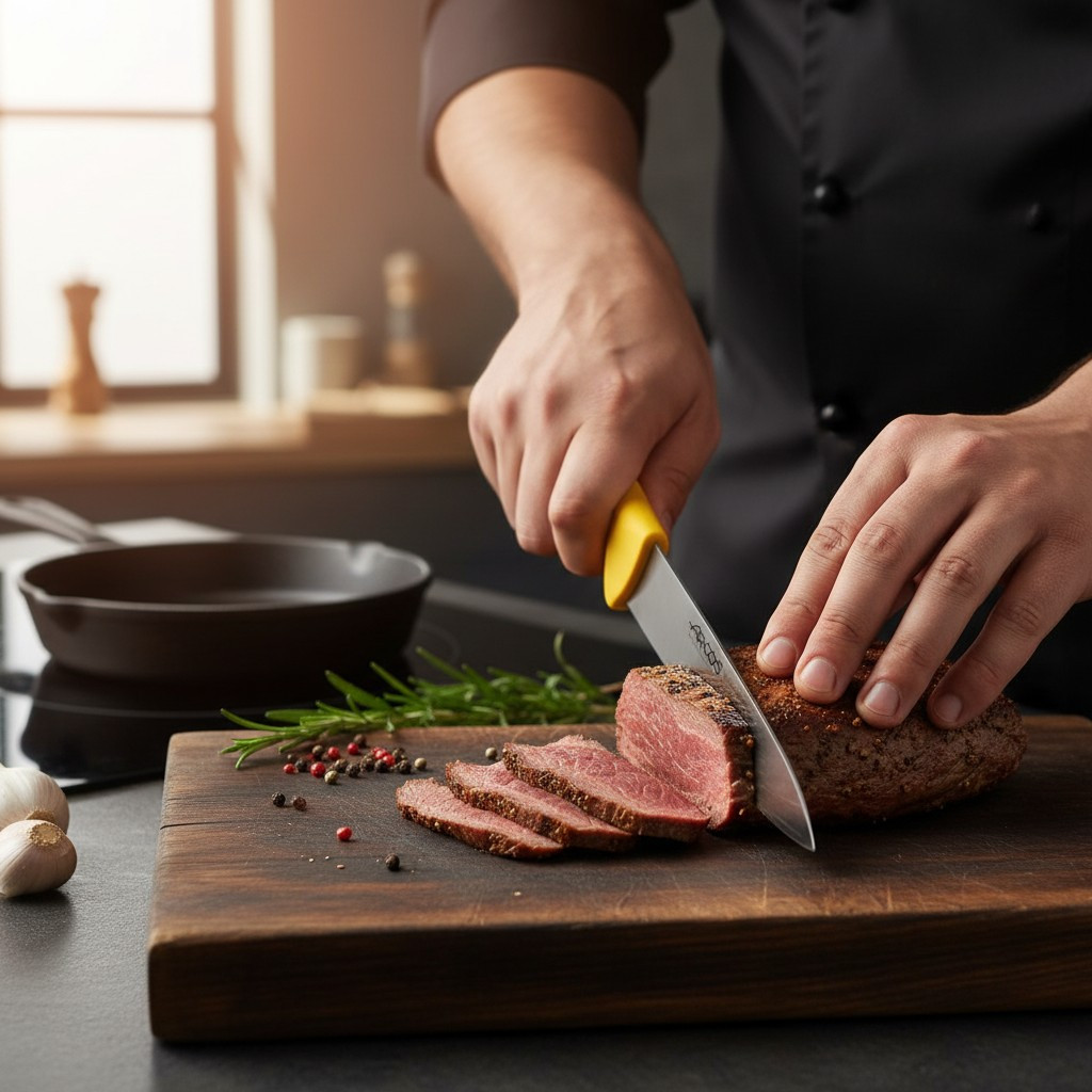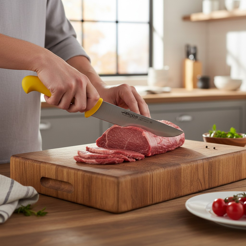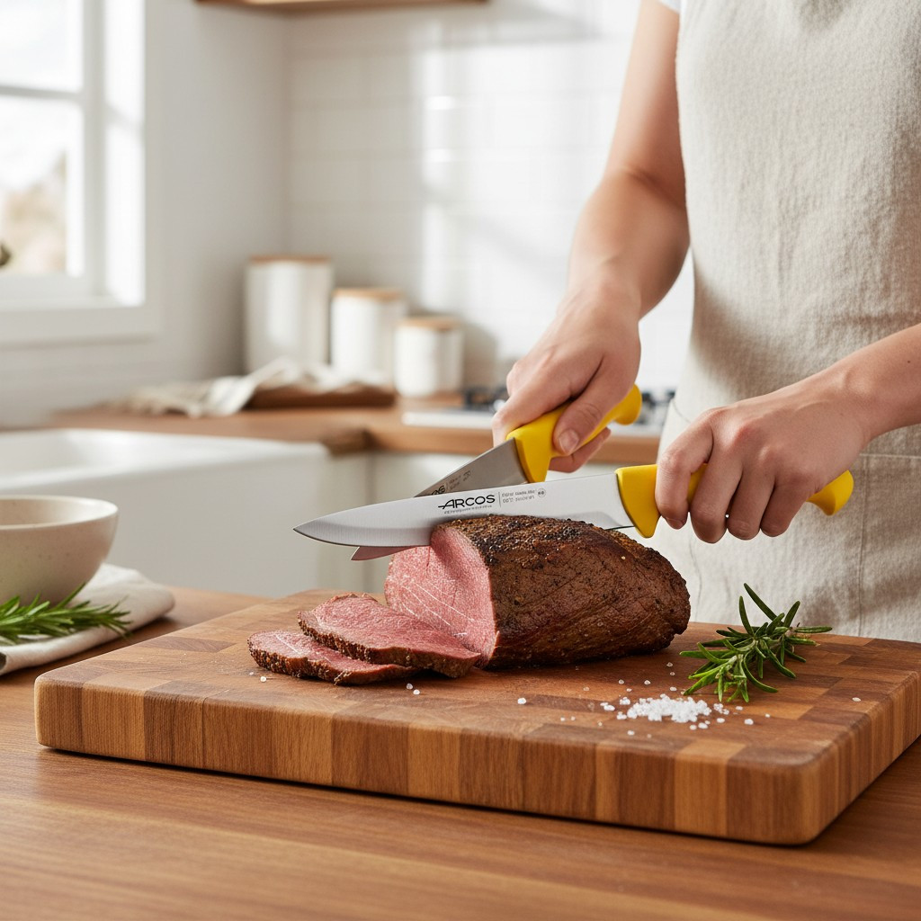 Az Arcos henteskés egy kiváló minőségű, professzionális eszköz, amelyet a hentesek és konyhafelhasználók számára terveztek. A kés penge hossza 21 cm, ami ideális húsok, zöldségek és más élelmiszerek vágásához.A kés penge anyaga rozsdamentes acél, amely kiváló élezhetőséget és tartósságot biztosít. A penge éles és precíz vágást tesz lehetővé, így könnyedén feldarabolhatja és szeletelheti az élelmiszereket.A sárga nyél nemcsak esztétikus megjelenést kölcsönöz a kéznek, hanem kényelmes fogást is biztosít. Az ergonomikus kialakításnak köszönhetően a kés kényelmesen illeszkedik a kézbe, és csökkenti a fáradtságot hosszabb használat során.Az Arcos henteskés kiváló minőségű anyagokból készül, és gondosan kidolgozott részletekkel rendelkezik. A kés tartós és ellenálló, így hosszú élettartammal rendelkezik. Könnyen tisztítható és karbantartható, így higiénikus használatot biztosít.Ez a henteskés ideális választás mind a profi szakácsok, mind a háziasszonyok számára, akik értékelik a minőséget és a funkcionalitást. Használja az Arcos henteskést a konyhában, és élvezze a könnyű és hatékony vágást minden főzési vagy sütési projekt során.