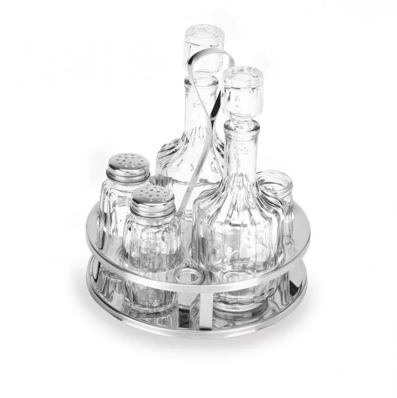 Tegye még praktikusabbá és rendezettebbé az étkezéseket ezzel a stílusos 5 részes asztali patika szettel, amely most fogvájó tartóval is rendelkezik! Ez a komplett készlet tartalmaz egy só- és borsszórót, egy fogvájó tartót, egy olajtartót és egy ecettartót, mindezt egy elegáns, 17 cm magas állványban. Így minden alapvető fűszer, ízesítő és a fogvájó is kéznél lesz az asztalon. Az elegáns és helytakarékos kialakítás ideális választás éttermek, kávézók és bisztrók asztalaira, de otthoni használatra is tökéletes megoldás a családi étkezésekhez vagy vendégváráshoz. A szett modern megjelenésével bármilyen asztalterítékhez jól passzol.
