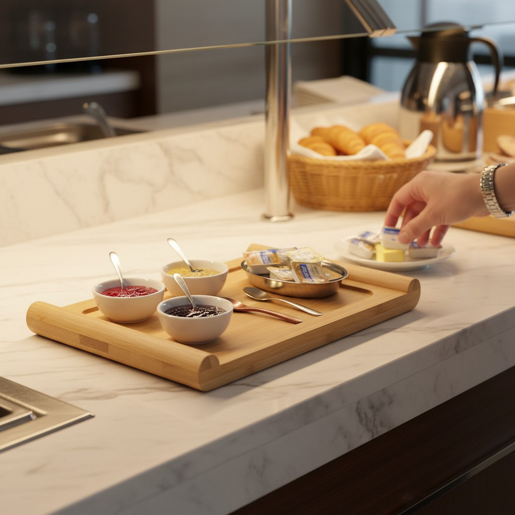 A természetes bambusz anyag meleg, prémium megjelenést biztosít, amely látványosan kiemeli a kínált ételeket. Kiváló választás hotelek, panziók és igényes vendéglátó egységek számára.