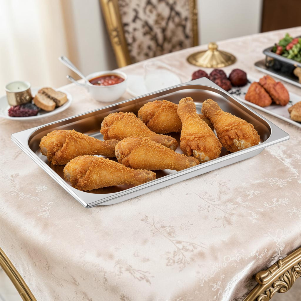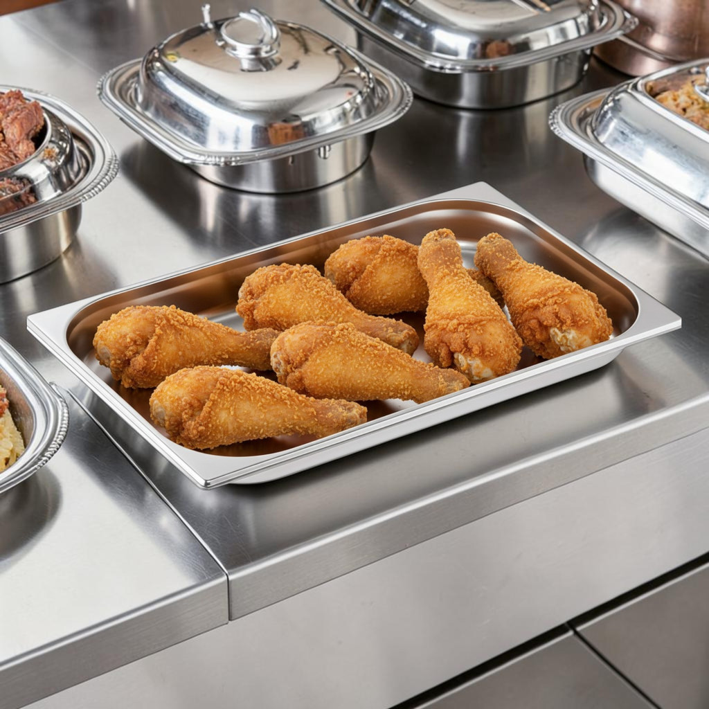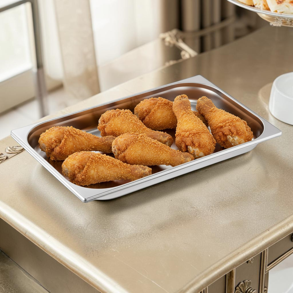 A Gastronorm 1/1 szabvány (kb. 53×32,5 cm) biztosítja a kompatibilitást minden professzionális vendéglátó rendszerrel, például bain-marie, melegentartó pultok és hűtőpultok esetén.
