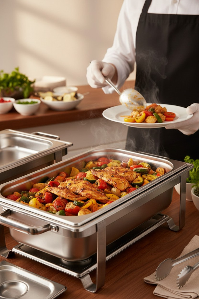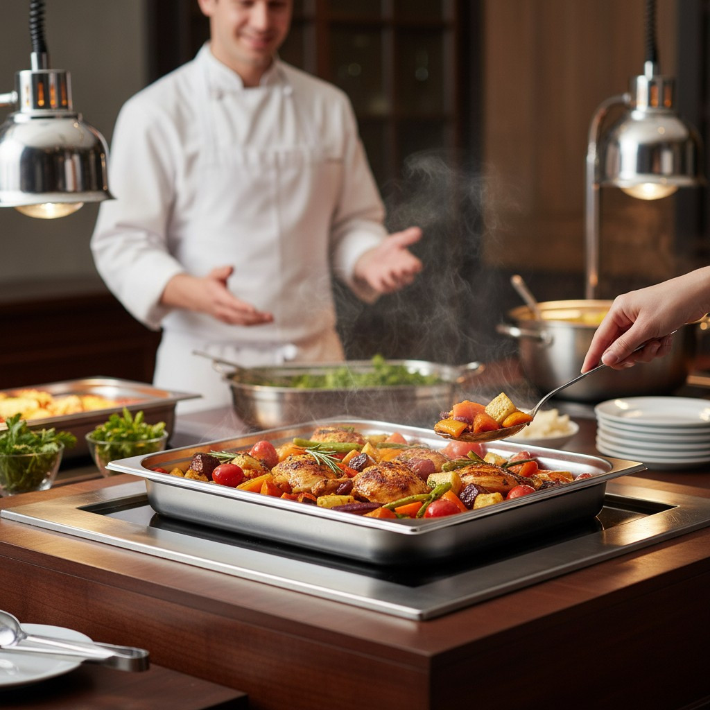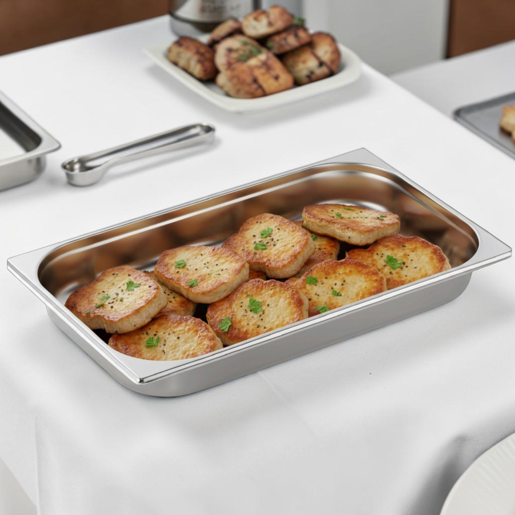 A Gastronorm 1/1 szabvány (kb. 53×32,5 cm) biztosítja a kompatibilitást minden professzionális vendéglátó berendezéssel, például bain-marie, melegentartó pultok és hűtőpultok esetén.