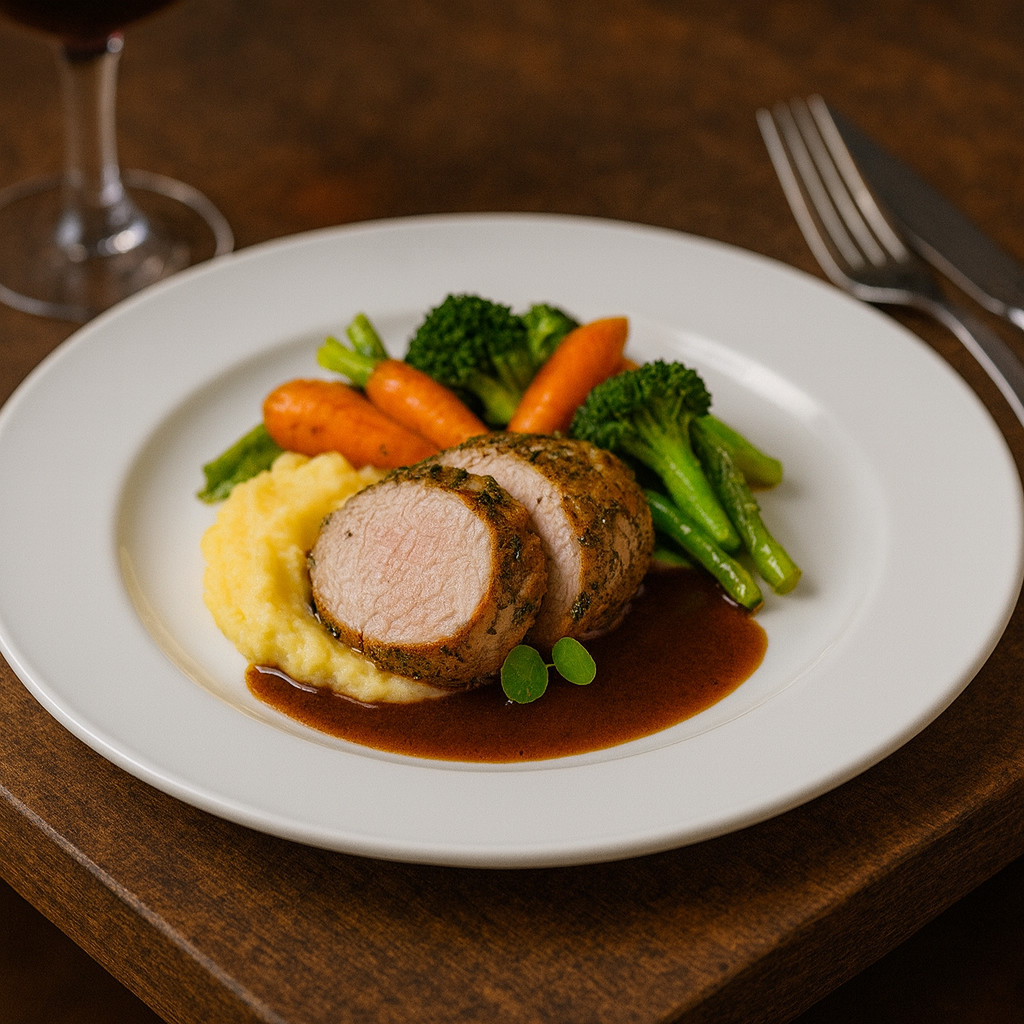 Boj fehér porcelán 23 cm-es menüs tányéron sülthús burgonyapürével és zöldségekkel, elegáns éttermi tálalásban, fine dining hangulatban.