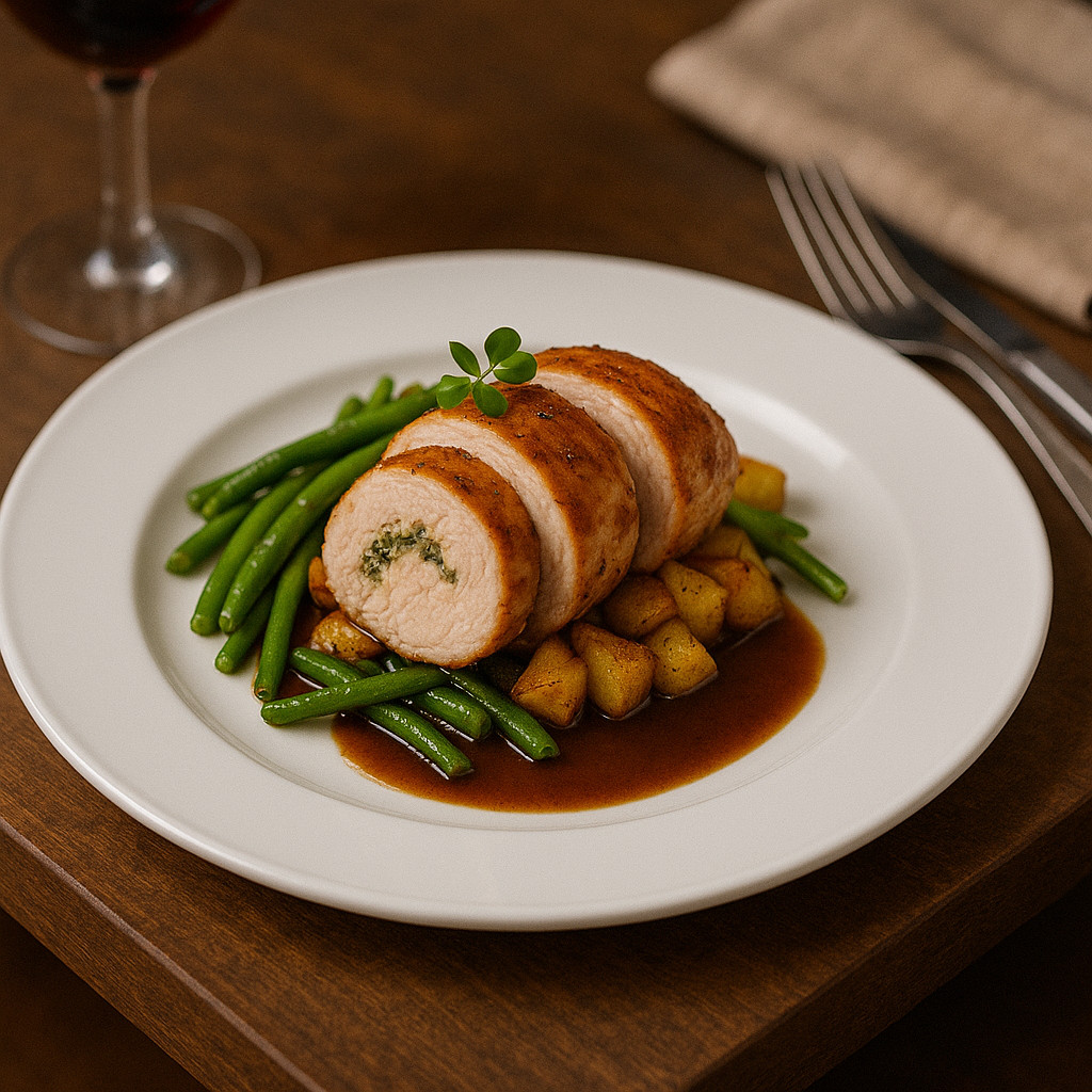 Boj fehér porcelán 23 cm-es menüs tányéron töltött csirkemell zöldbabbal, sült burgonyával és mártással, elegáns fine dining éttermi tálalásban, borospohárral a háttérben.