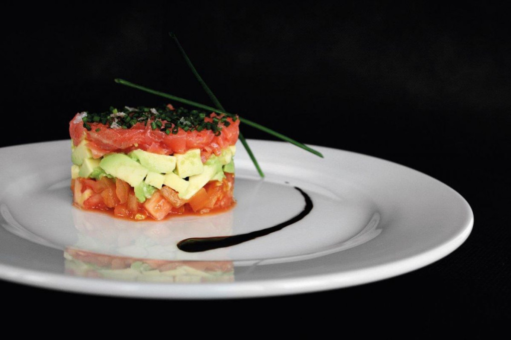 Boj fehér porcelán 26 cm-es főételes tányéron grillezett lazacfilé zöldspárgával, burgonyával és mártással, színes fine dining tálalásban, elegáns éttermi környezetben.