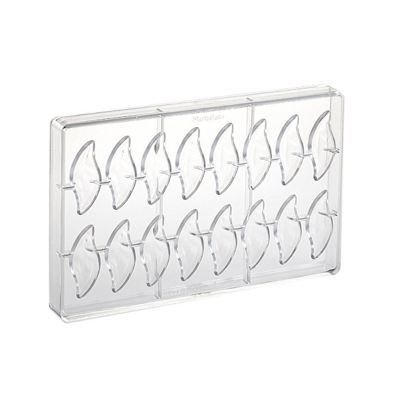 A Wave 3 Bonbon polikarbonát csokoládéforma professzionális bonbonok és pralinék készítéséhez használható hullám mintás bonbon forma. A forma hosszúkás, modern bonbon formát készít, amely ideális kézműves csokoládé és praline készítéshez.