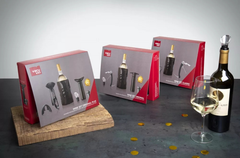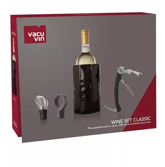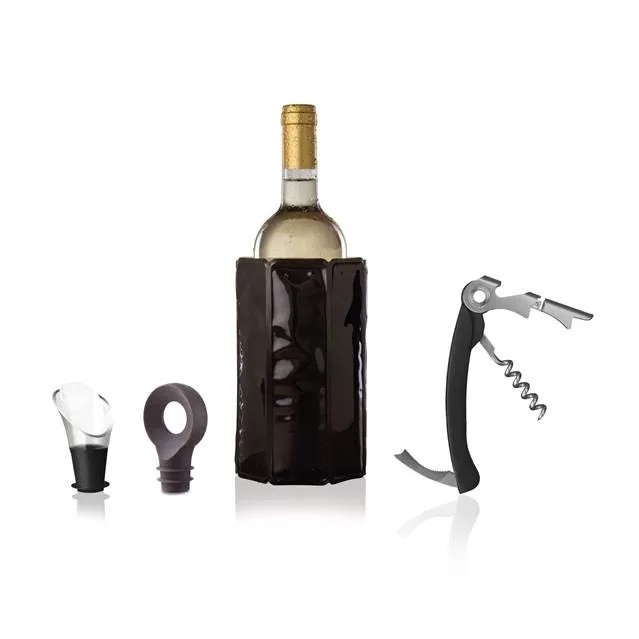 A készlet tartalmaz egy pincér dugóhúzót, amely alkalmas parafadugós borosüvegek nyitására, egy boros kiöntőt a cseppmentes kitöltéshez, egy boros dugót a felbontott palack visszazárásához, valamint egy borhűtő palackhuzatot, amely segít a bor hőmérsékletének megtartásában.