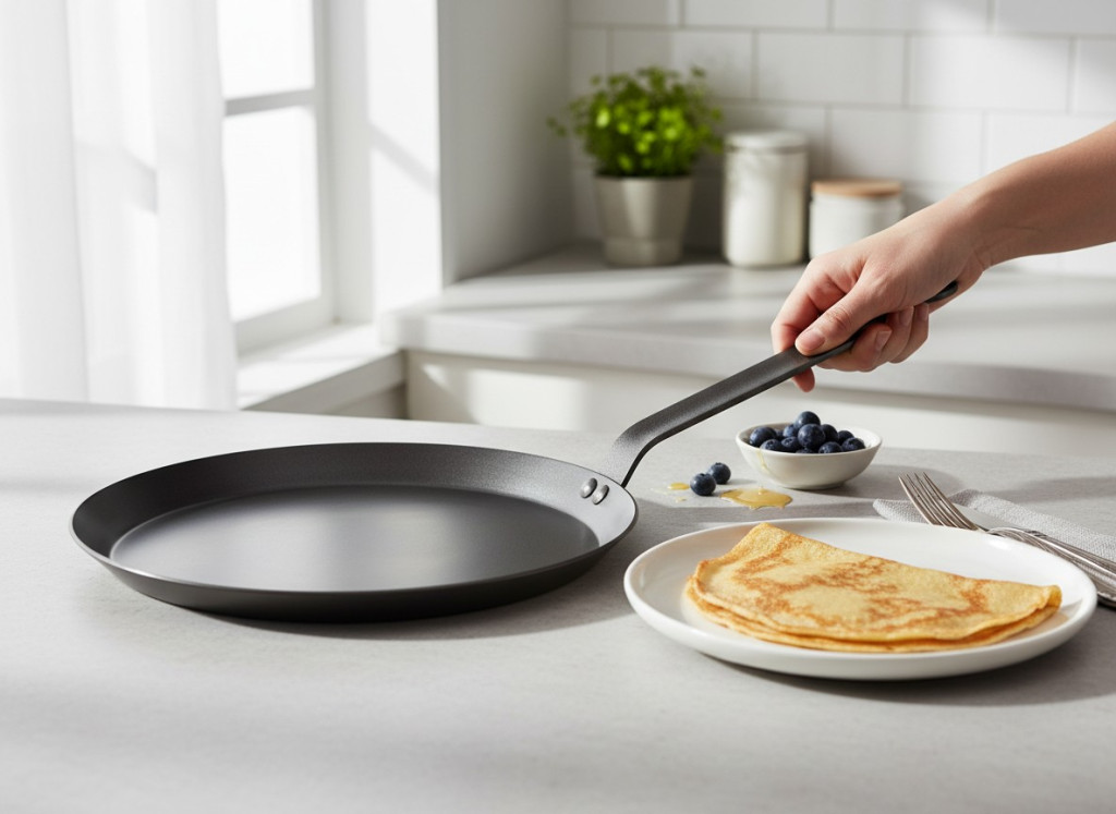 GasztroZoli tipp: A de Buyer Carbone Plus 30 cm-es palacsintasütő akkor kerül elő, amikor nem kompromisszumot, hanem igazi kérget szeretnél. Brutális hőtartás, gyors pirítás és természetes vasfelület – minél többet használod, annál jobb lesz.