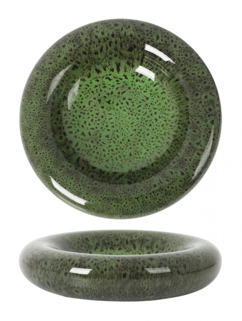 A reaktív máz hatásának köszönhetően minden darab egyedi textúrával és színátmenettel rendelkezik. Az erdei mohazöld árnyalat a természet mélységeit idézi, sötét pöttyözéssel és márványszerű fényes felülettel – mintha egy erdő mélyén született volna ez az étkészlet.