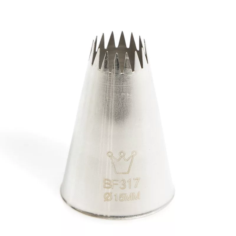 Csillagcső 15 mm francia csillagRozsdamentes polirozott acél, kerek habcső, táskához vagy habzsákhoz, 2-24 mm-es kimeneti lyuk átmérővel. Torták, sütemények, kekszek habbal, krémmel való dekorálására használt eszköz. A névben szereplő átmérő a kimeneti nyílásra vonatkozik. Élelmiszerbiztonságos termék. Megfelelőségi nyilatkozattal rendelkező cukrászati termék. Olasz gyártású cukrászati eszköz. Termék méret: nagy átmérő 30 mm, magasság 50 mm. Első használat előtt alaposan mossa el. Mosogatógépben mosható.