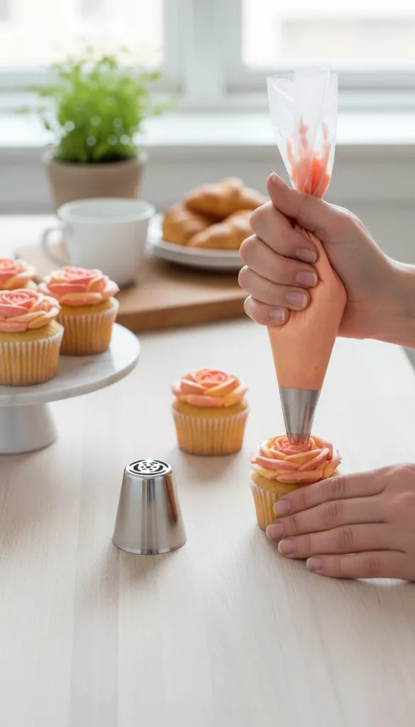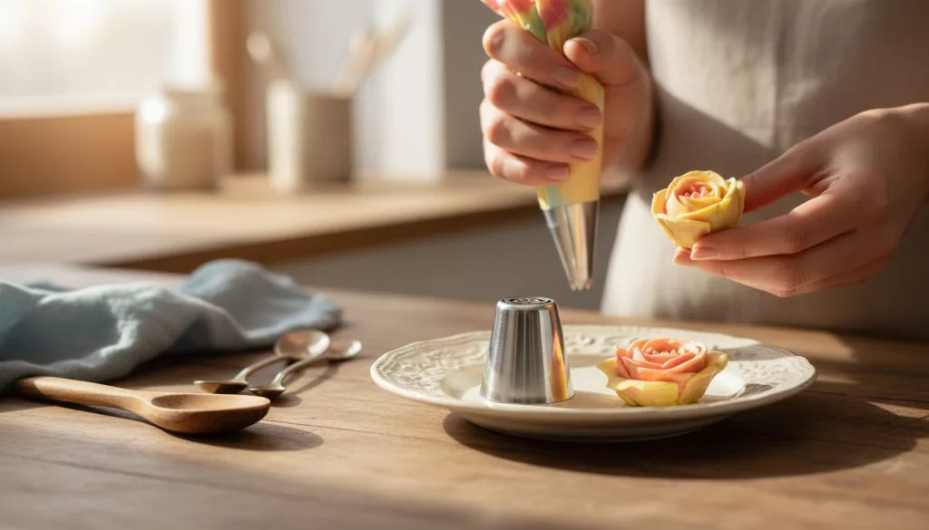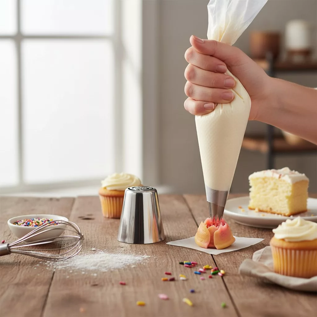 - Használat közben: Helyezze a dekorcsövet a habzsákba, és nyomja ki a kívánt mennyiségű krémet vagy más díszítőanyagot.