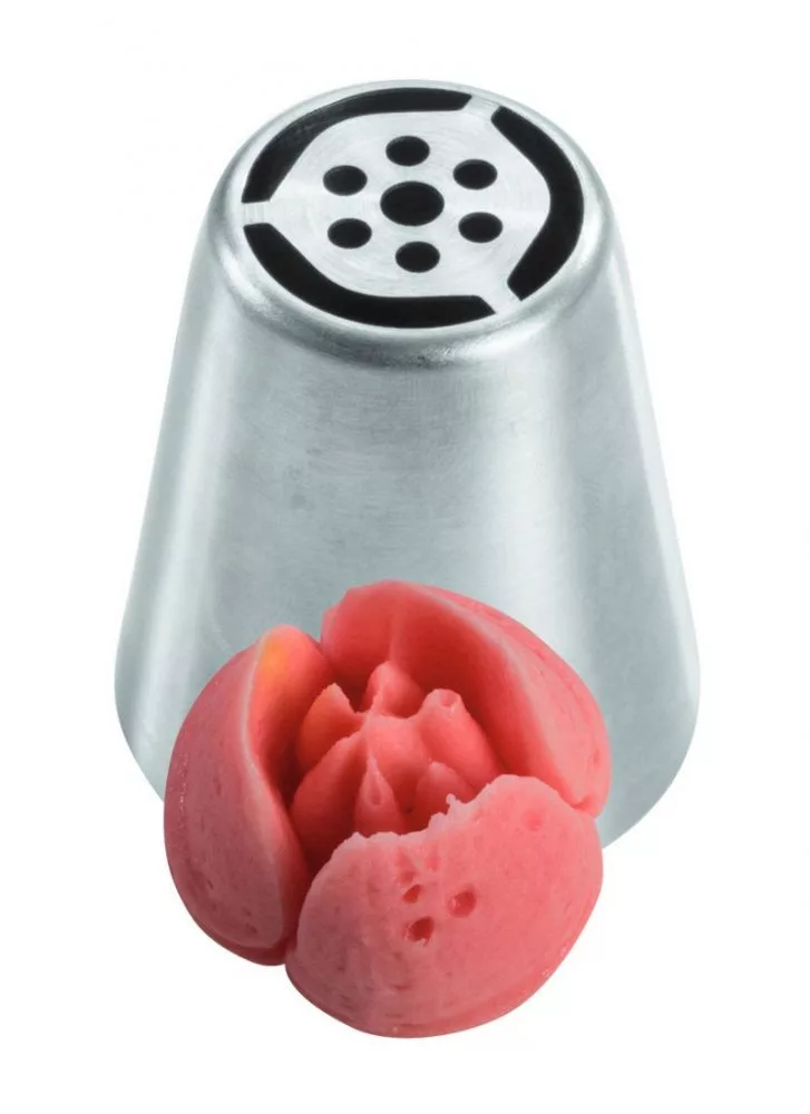 A díszítőcső rozsdamentes acélból készül, ami pontos élképzést, tartósságot és higiénikus használatot biztosít. A többnyílású kialakítás lehetővé teszi, hogy a krém egyszerre több irányba áramoljon, így alakul ki az orosz stílusra jellemző virágforma.