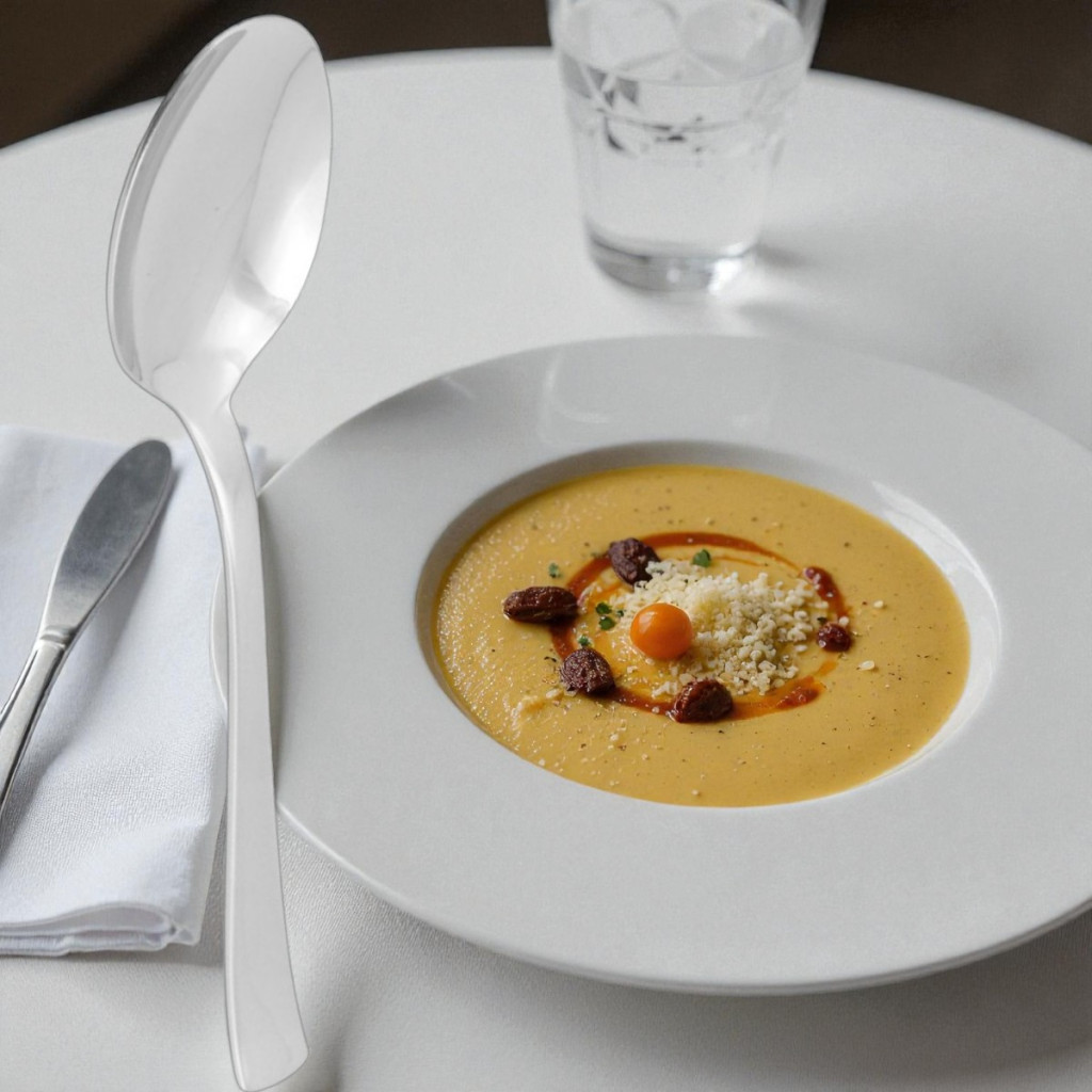 Doram 18/10 rozsdamentes evőkanál – használat közben, leves vagy desszert tálalásakor, modern és kifinomult asztali elrendezésben