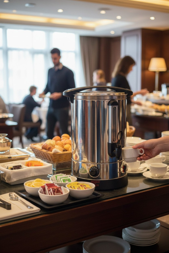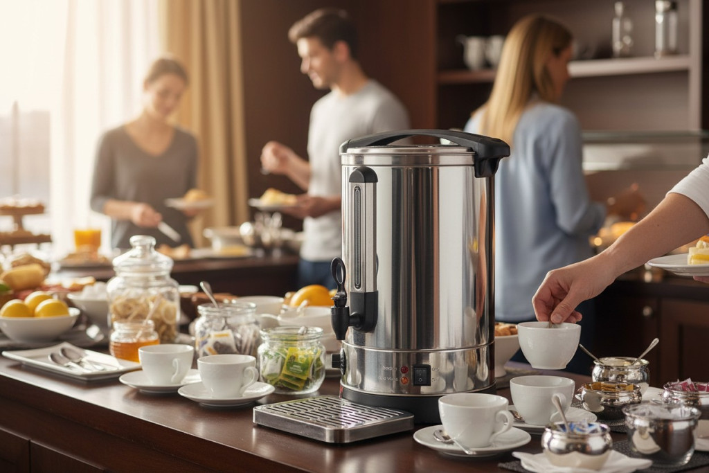 A készülék beépített fűtőtesttel gyors vízmelegítést biztosít, majd a 30–110°C között állítható termosztát segítségével a folyadékot stabil hőmérsékleten tartja. Ez elengedhetetlen folyamatos kiszolgálás esetén.