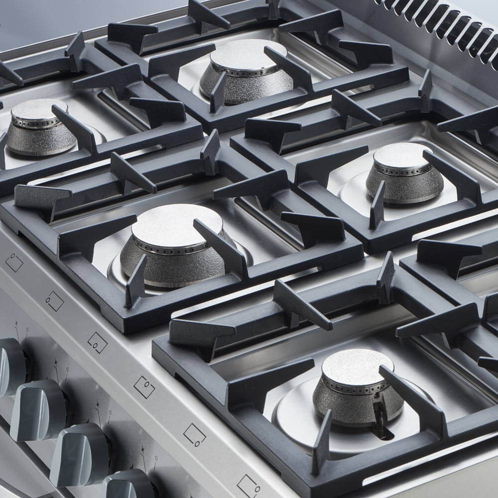 - Kiemelkedő Főzőlap Kapacitás: A **hat égőfej** (3x3,5 kW és 3x5 kW konfigurációban) maximális rugalmasságot nyújt a főzési feladatokhoz. Legyen szó gyors forralásról vagy lassú párolásról, minden igényt kielégít.