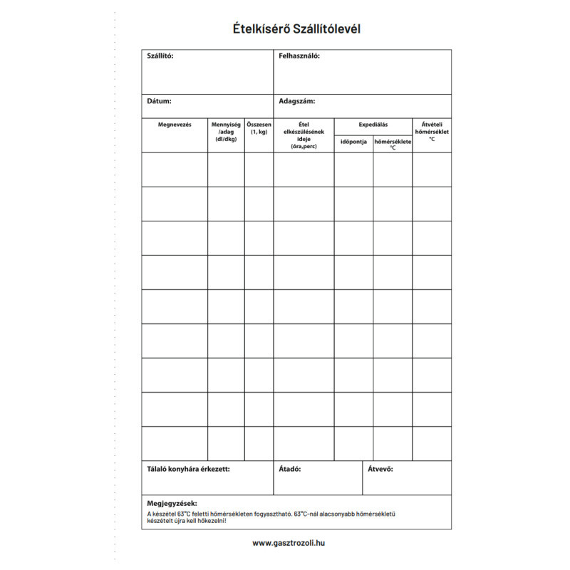 Az ételkísérő szállítólevél nélkülözhetetlen eszköz a vendéglátóipari egységek és ételszállító vállalkozások számára. Ez a praktikus, 15×21 cm méretű, 25×3 lapos dokumentumcsomag segít a zökkenőmentes és szabályszerű élelmiszerszállításban. Az első oldala perforált a könnyű kezelhetőség és szétválasztás érdekében, így a dokumentáció gyors és egyszerű.
