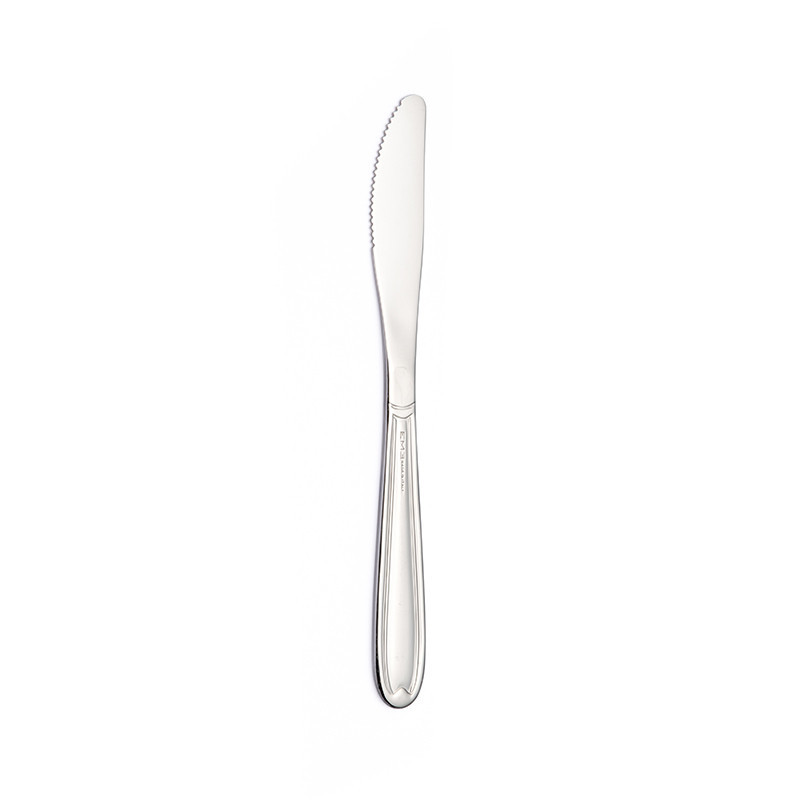 Az Euro Eco desszertkés egy kiváló minőségű evőeszköz, amely a romantikus stílus és a kifinomult elegancia jegyében készült. A 2 mm vastag, kiváló minőségű 18/10-es rozsdamentes acélból készült kés fényes felületkezeléssel rendelkezik. A fogantyúkon található finom dekoráció a klasszikus ízlésű terítékekhez illik tökéletesen. A harmonikus arányú, hagyományos forma kényelmes használatot biztosít. Az Euro evőeszköz kollekció Olaszországban készül, és mosogatógépben is mosható. A széles választék lehetővé teszi, hogy az Ön igényeinek leginkább megfelelő összeállítást válassza.