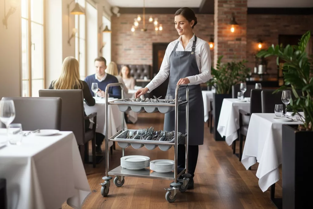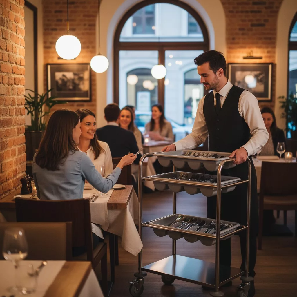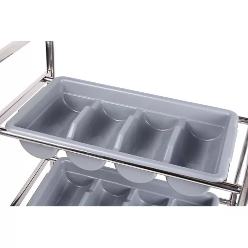 Ez a 3 polcos evőeszköztartó kocsi egy nélkülözhetetlen eszköz a nagykonyhákban, éttermekben és egyéb vendéglátóipari egységekben. Segítségével könnyedén és higiénikusan tárolhatja az evőeszközöket, így azok mindig kéznél lesznek a személyzet számára. A rozsdamentes acél anyagnak köszönhetően a kocsi tartós, könnyen tisztítható és megfelel a legszigorúbb higiéniai követelményeknek. A 3 polc elegendő helyet biztosít a különböző evőeszközök számára. A kerekeknek köszönhetően a kocsi könnyen mozgatható és áthelyezhető.