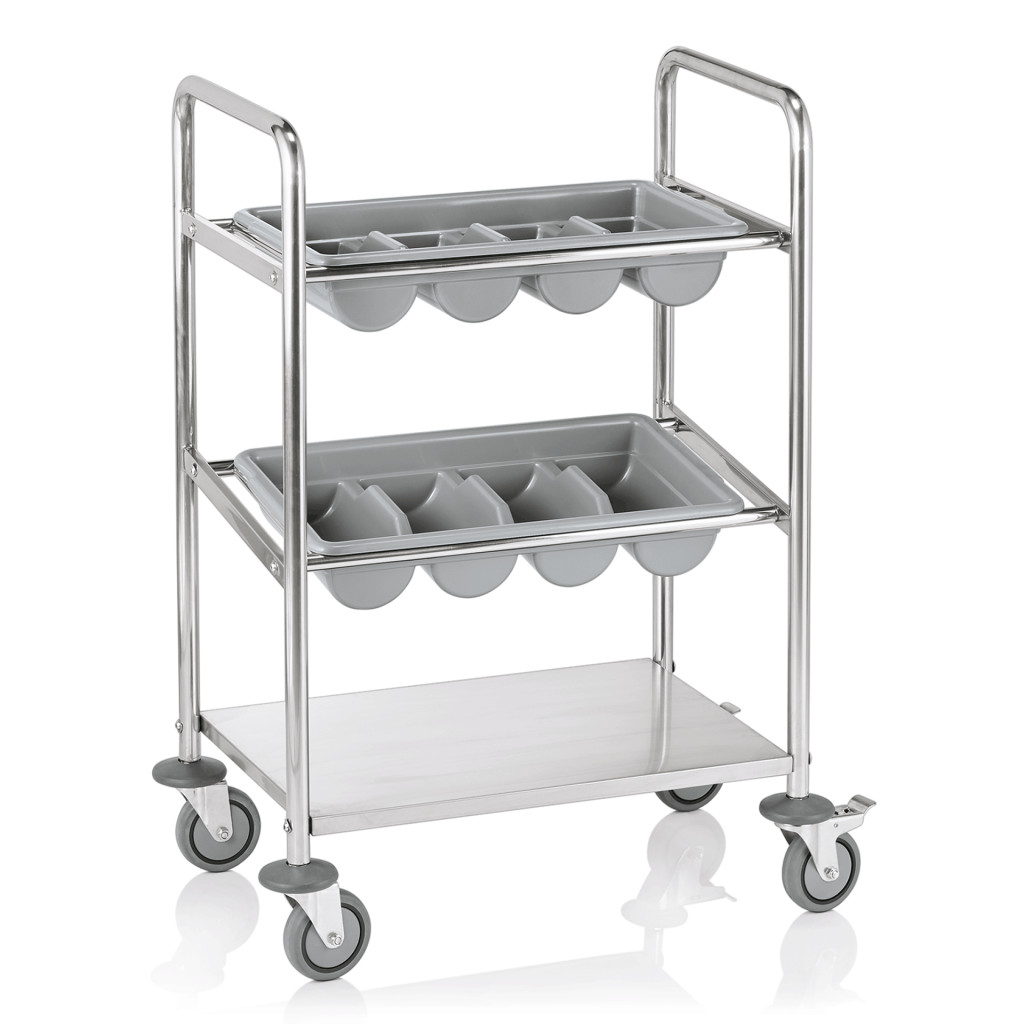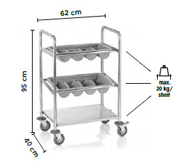 Tároló polccal, 4 db ütésvédelemmel ellátott forgó görgővel, amelyek közül 2 fékkel rendelkezik, a szállító kocsi 2 evőeszköz-tálcát tartalmaz. A polcok közti távolság 25 cm.