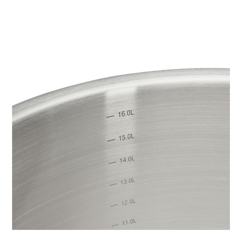 Ez a de Buyer Prim Appety fazék 15 literes kapacitással és 28 cm-es átmérővel ideális nagy mennyiségű ételek készítéséhez. A szendvicstalpas kivitel biztosítja az egyenletes hőelosztást, a rozsdamentes acél anyag pedig tartósságot és könnyű tisztíthatóságot garantál. 15 literig, lézergravírozott, skálázott űrtartalom jelöléssel.