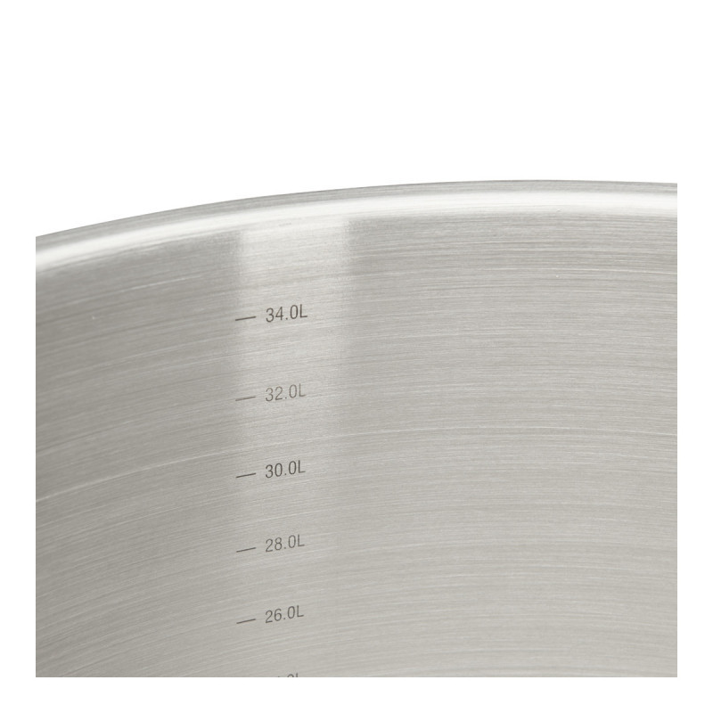 A 34 literes de Buyer Prim'Appety fazék professzionális minőségű, 36 cm-es átmérőjével ideális nagy mennyiségű levesek, pörköltek és egytálételek elkészítéséhez. Az 18/10 rozsdamentes acélból készült szendvicstalpas kialakítás egyenletes hőelosztást biztosít, megakadályozva az ételek leégését. Ergonomikus, szegecselt fogantyúi stabilitást és biztonságot nyújtanak, miközben kompatibilis minden típusú főzőlap-típussal, beleértve az indukciót is.