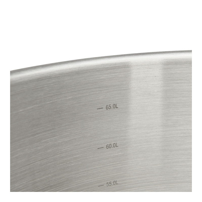 Az edény AISI 304 rozsdamentes acélból készül, amely tartós, higiénikus és ellenáll a savas alapanyagoknak is. A belső felület szálcsiszolt szatén, ami megkönnyíti a tisztítást és jól bírja a napi intenzív használatot.