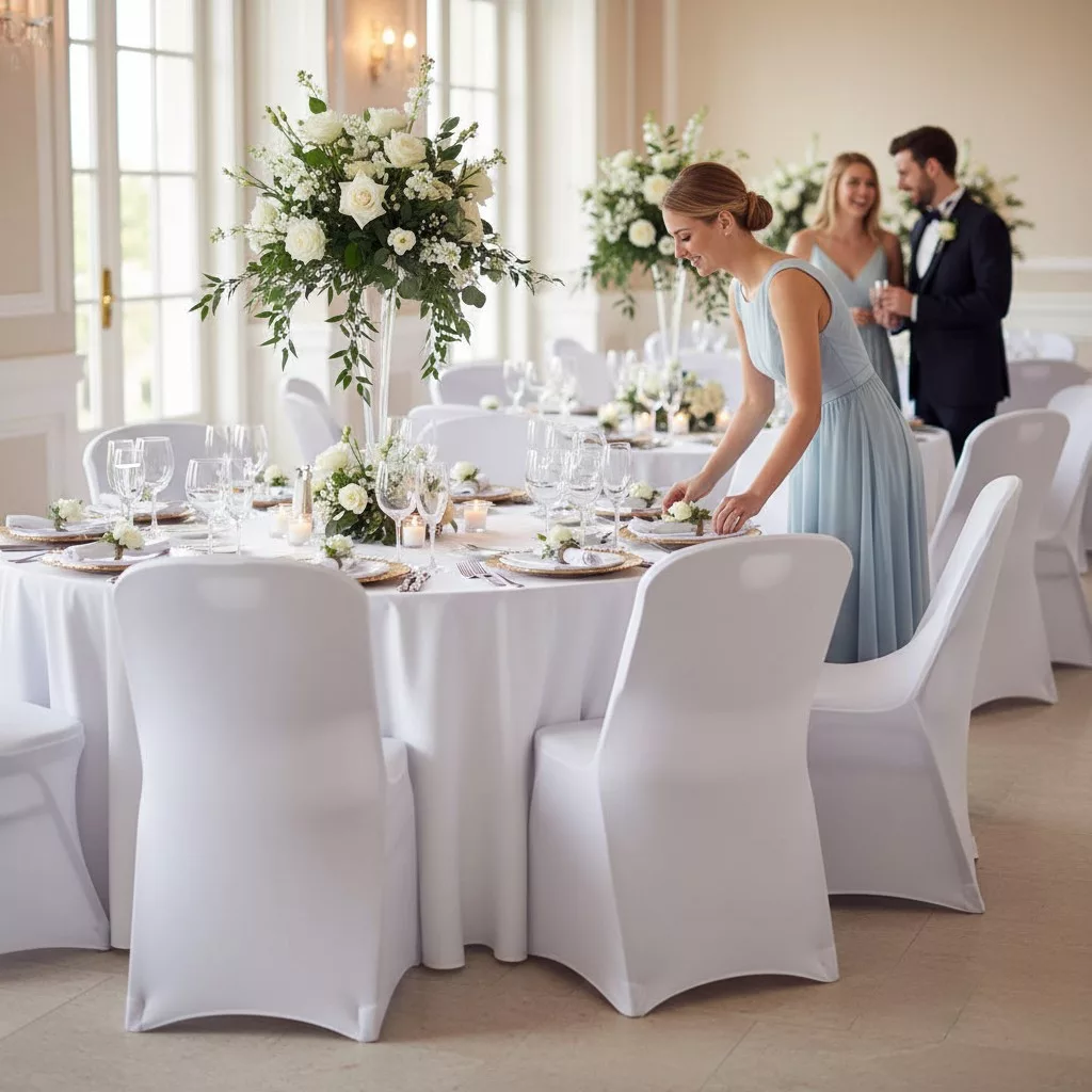 A fehér szín klasszikus, letisztult és prémium hatást kelt, ezért ideális esküvőkhöz, bankettekhez és elegáns rendezvényekhez.