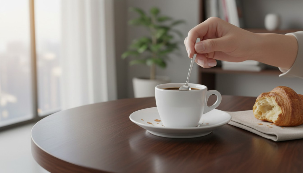 A kompakt méret helytakarékos, mégis elegendő helyet biztosít a csészének és egy kiskanálnak.