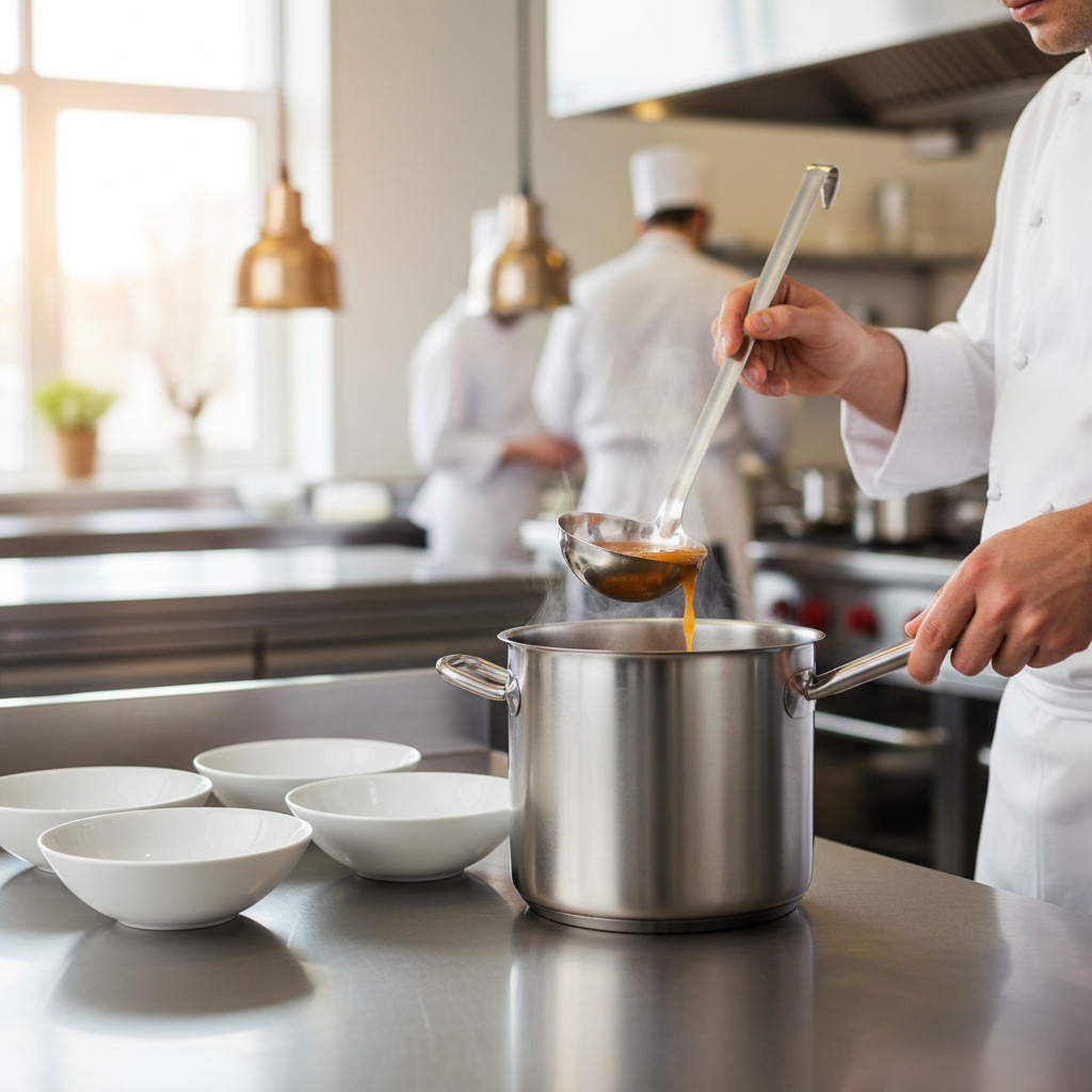 A GrandCHEF 0,15 literes (150 ml) merőkanál ideális választás levesek, főzelékek, szószok és alaplevek pontos adagolásához. A 9 cm átmérőjű merőrész kiegyensúlyozott mennyiséget biztosít, amikor a 100 ml már kevés, a 200 ml pedig sok lenne.