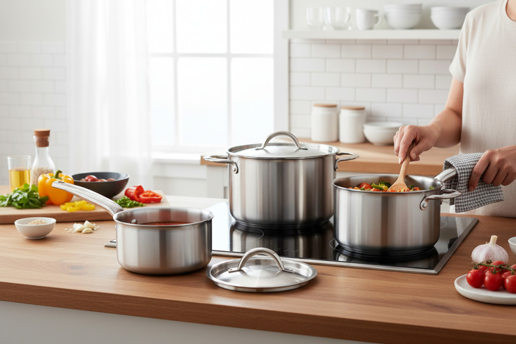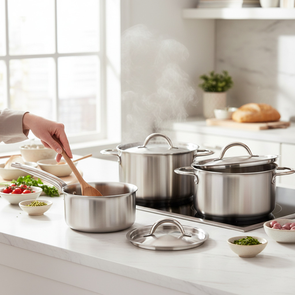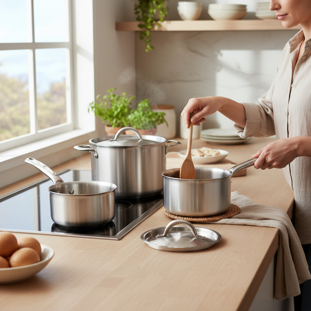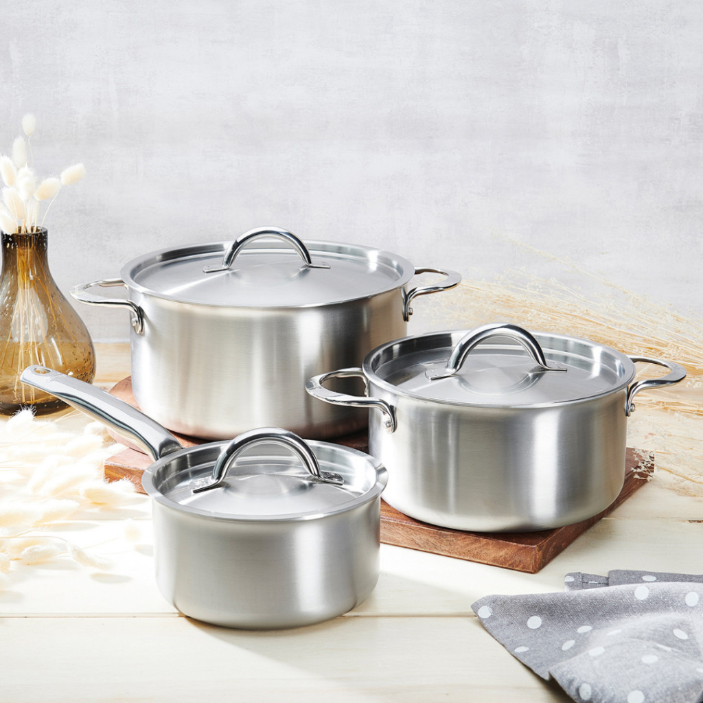 Az edények 3 rétegű, többrétegű rozsdamentes acélból készülnek, AISI 304 minőségű belső felülettel. A hő az edény teljes felületén egyenletesen oszlik el, nem csak az alján, így nincs szükség külön diffúzor alapra – ez növeli a hatékonyságot és a reakciósebességet.