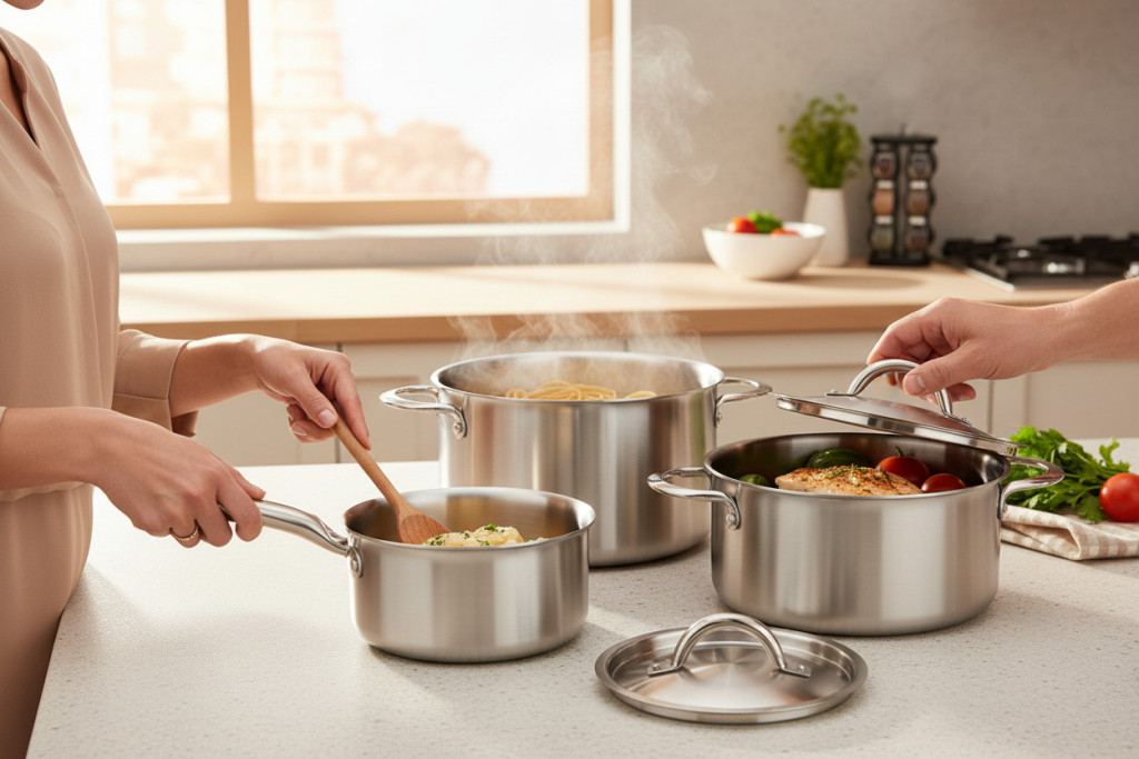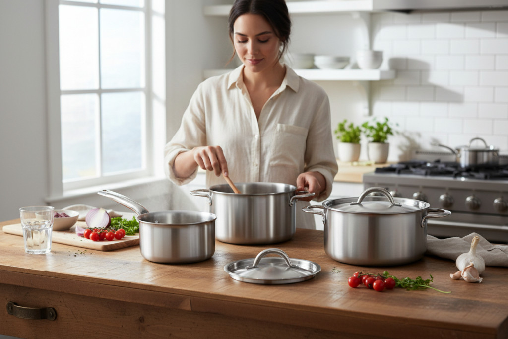 A de Buyer Alchimy gyorsforraló-lábas készlet professzionális felhasználásra tervezett, többrétegű rozsdamentes acél edénycsalád. A készlet azoknak készült, akik a főzés során gyors reakcióidőt, homogén hőeloszlást és pontos szabályozhatóságot várnak el.