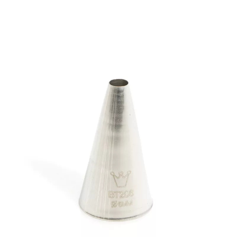 Habcső 6 mm, rozsdamentesRozsdamentes polirozott acél, kerek habcső, táskához vagy habzsákhoz, 2-24 mm-es kimeneti lyuk átmérővel.Torták, sütemények, kekszek habbal, krémmel való dekorálására használt eszköz.A névben szereplő átmérő a kimeneti nyílásra vonatkozik.Élelmiszerbiztonságos termék.Megfelelőségi nyilatkozattal rendelkező cukrászati termék.Olasz gyártású cukrászati eszköz.Termék méret: nagy átmérő 25 mm, magasság 50 mm.Első használat előtt alaposan mossa el.Mosogatógépben mosható.