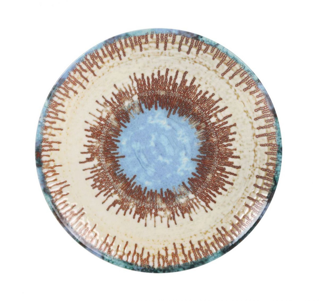 - Design: Mediterrán stílus, kék középpel és barna sugaras mintával.