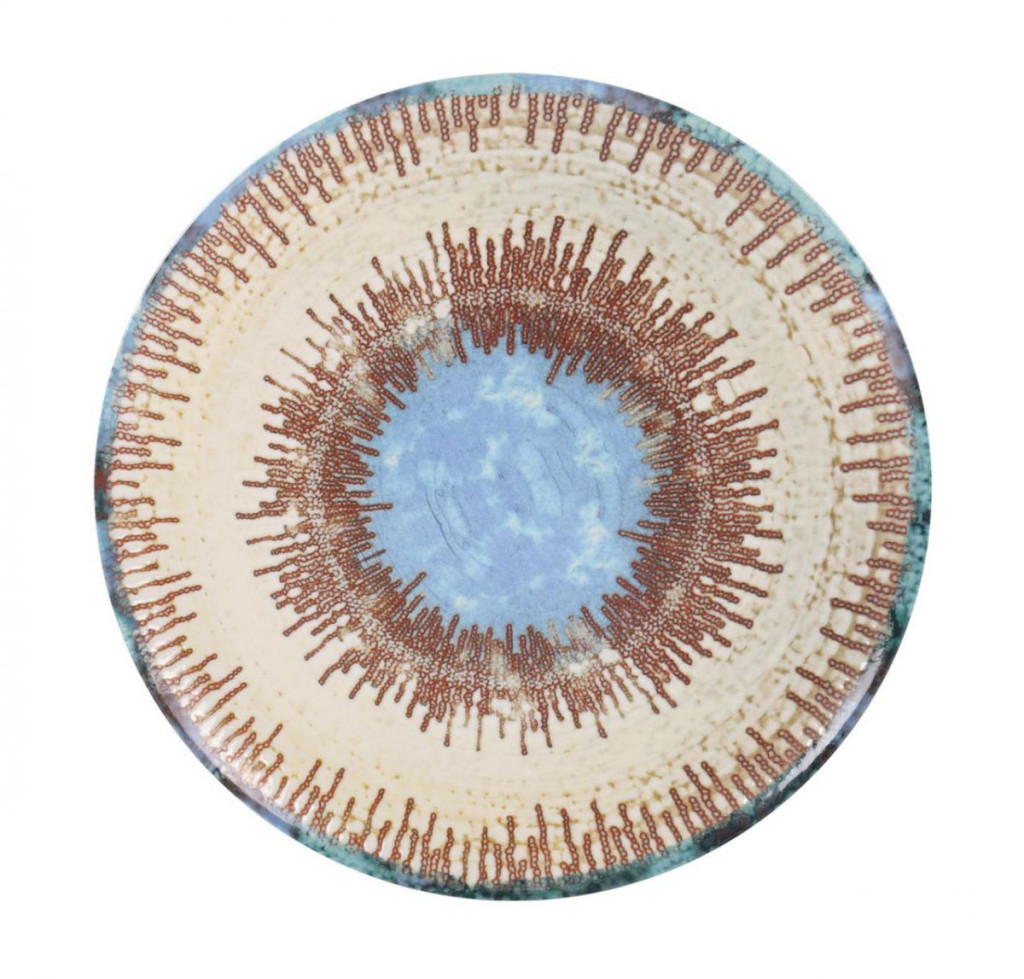- Design: Mediterrán stílus, kék középponttal és barna sugaras mintával.