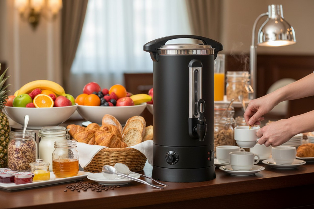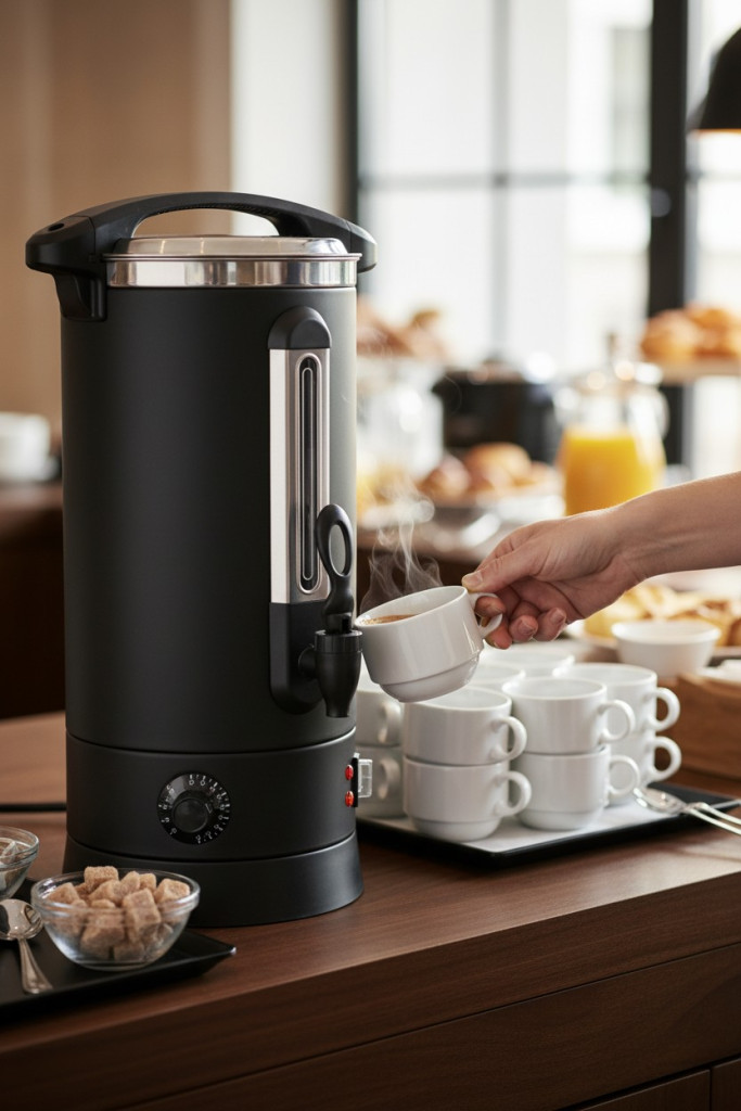 A cseppmentes adagolócsap kényelmes és tiszta adagolást biztosít, ezért a vendégek vagy a személyzet könnyen tölthetnek csészébe, bögrébe vagy pohárba. A vízszintjelző segít az ellenőrzésben, a biztonsági termosztát pedig a biztonságos működést támogatja. A készülék tápellátásjelző fénnyel is rendelkezik.