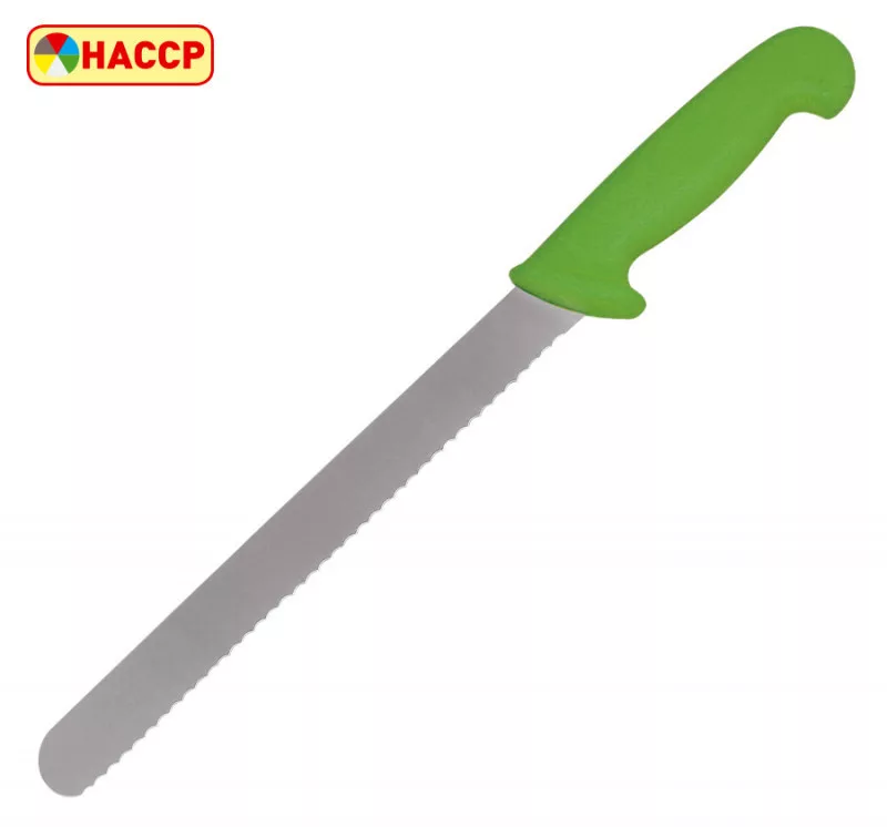 A kenyérvágó kés modern és stílusos megjelenésű, a zöld szín pedig frissességet és eleganciát sugároz.