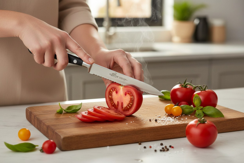 A Lion Sabatier Idéal paradicsomkés 12 cm recés pengéjének köszönhetően könnyedén szeletelhetők vele vékony héjú és puha belsejű alapanyagok, például paradicsom, citrusfélék vagy puha péksütemények. A fogazott él nem nyomja össze az alapanyagot, hanem könnyen átvágja a héjat.