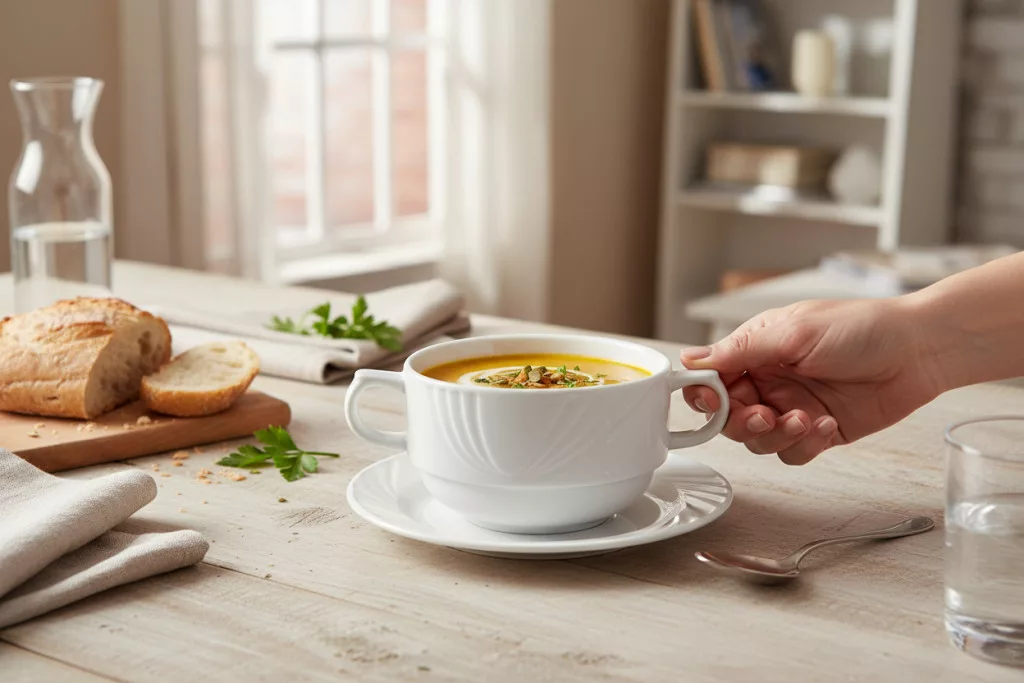 - Egytálételekhez: Bár elsősorban levesescsésze, kisebb adag egytálételek (pl. raguk) tálalására is alkalmas lehet.