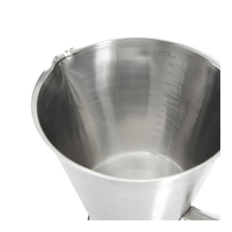 A mérőkancsó teljes egészében rozsdamentes acélból készült, így maximálisan ellenálló a hővel, savakkal és intenzív konyhai igénybevétellel szemben.