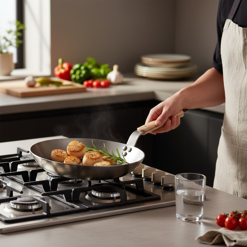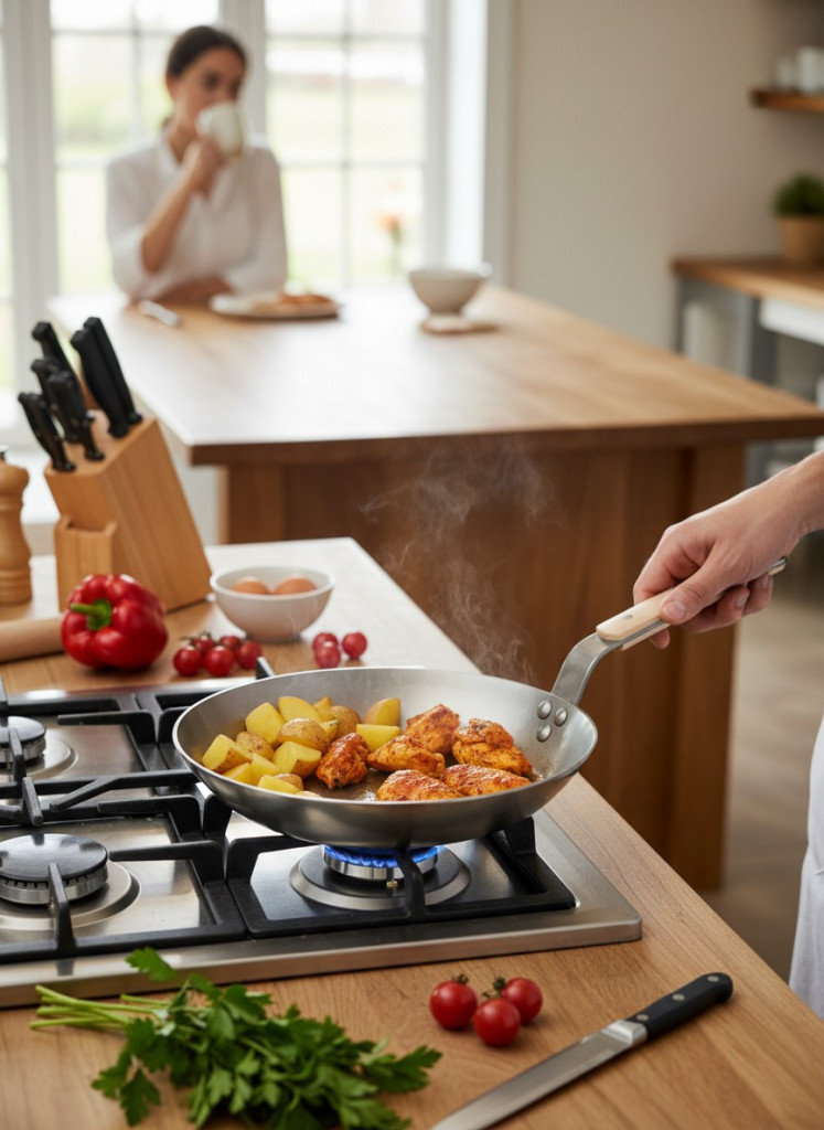 • 100% természetes anyagok: A serpenyő 100%-ban természetes szénacélból készül, amely tartós és környezetbarát választás. Nem tartalmaz semmilyen káros vegyi anyagot vagy bevonatot.