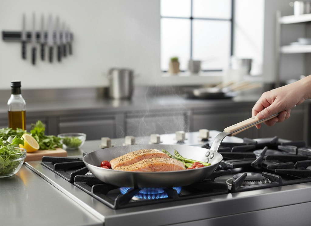 • Kiváló hővezetés: A szénacél kiváló hővezető képessége biztosítja, hogy az étel egyenletesen süljön meg, így elkerülheti az égést és a nyers részeket. A hő egyenletesen oszlik el a serpenyő teljes felületén.