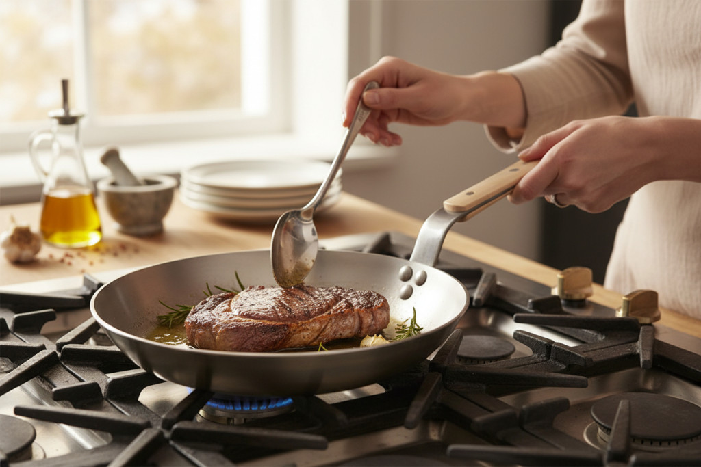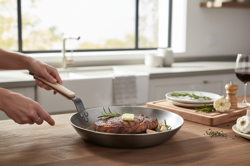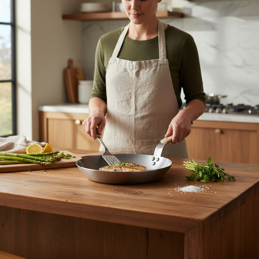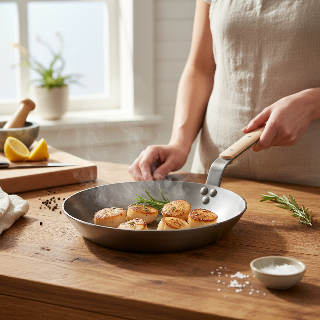 • 100% természetes anyagok: A serpenyő 100%-ban természetes szénacélból készül, amely tartós és környezetbarát választás. Nem tartalmaz semmilyen káros vegyi anyagot vagy bevonatot.