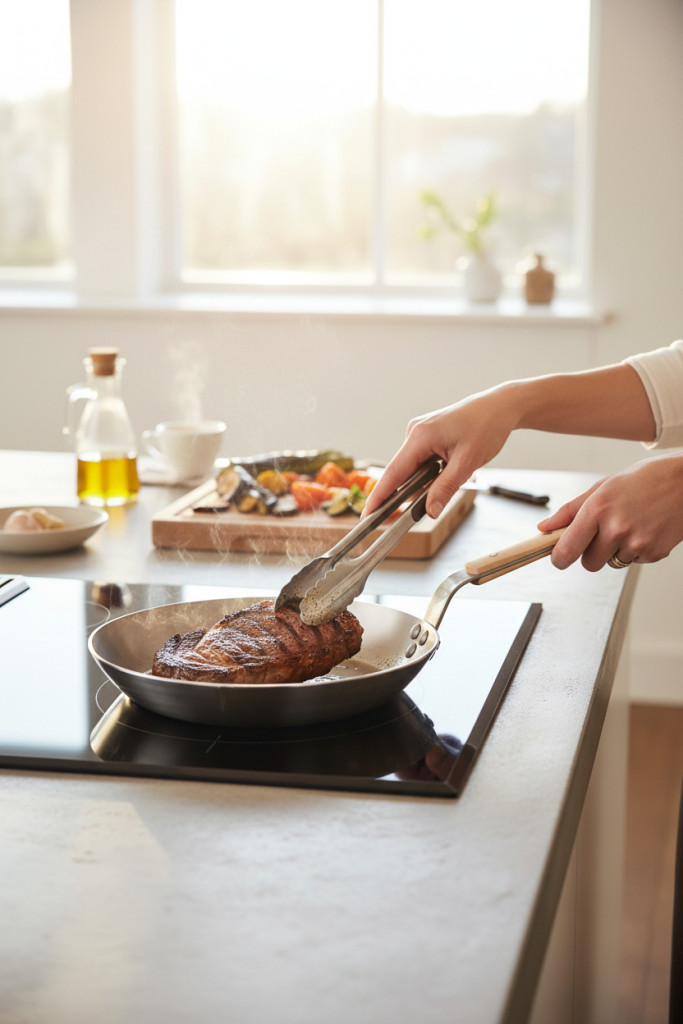 • Első használat előtt: Mossa el a serpenyőt forró vízzel és szappannal, majd alaposan szárítsa meg. Ezután kenje be vékonyan növényi olajjal, és hevítse fel, amíg enyhén füstölni nem kezd. Hagyja kihűlni, majd törölje ki az olajat. Ezt a folyamatot "beavatásnak" nevezik, és fontos a serpenyő megfelelő használatához.
