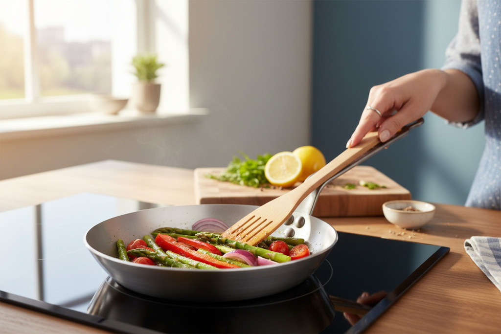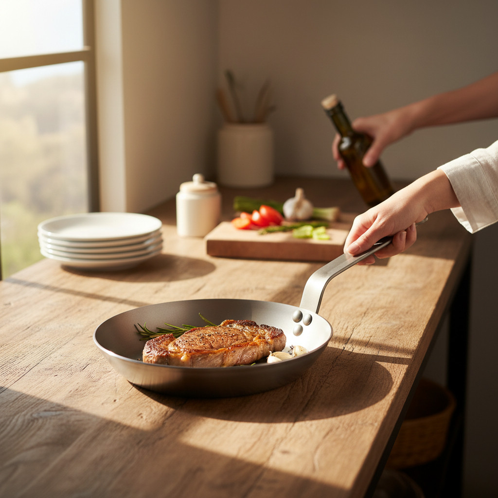 • Első használat előtt: Mossa el a serpenyőt forró vízzel és szappannal, majd alaposan szárítsa meg. Ezután kenje be vékonyan növényi olajjal, és hevítse fel, amíg enyhén füstölni nem kezd. Hagyja kihűlni, majd törölje ki az olajat. Ezt a folyamatot "beavatásnak" nevezik, és fontos a serpenyő megfelelő használatához.