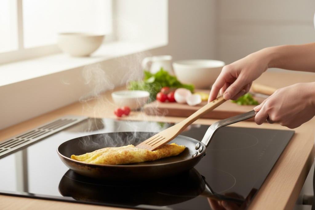 • Lapos kialakítás: A lapos kialakítás megkönnyíti az ételek megfordítását és kivételét a serpenyőből. Ideális omlettek, tükörtojások, palacsinták és más tojásételek készítéséhez.