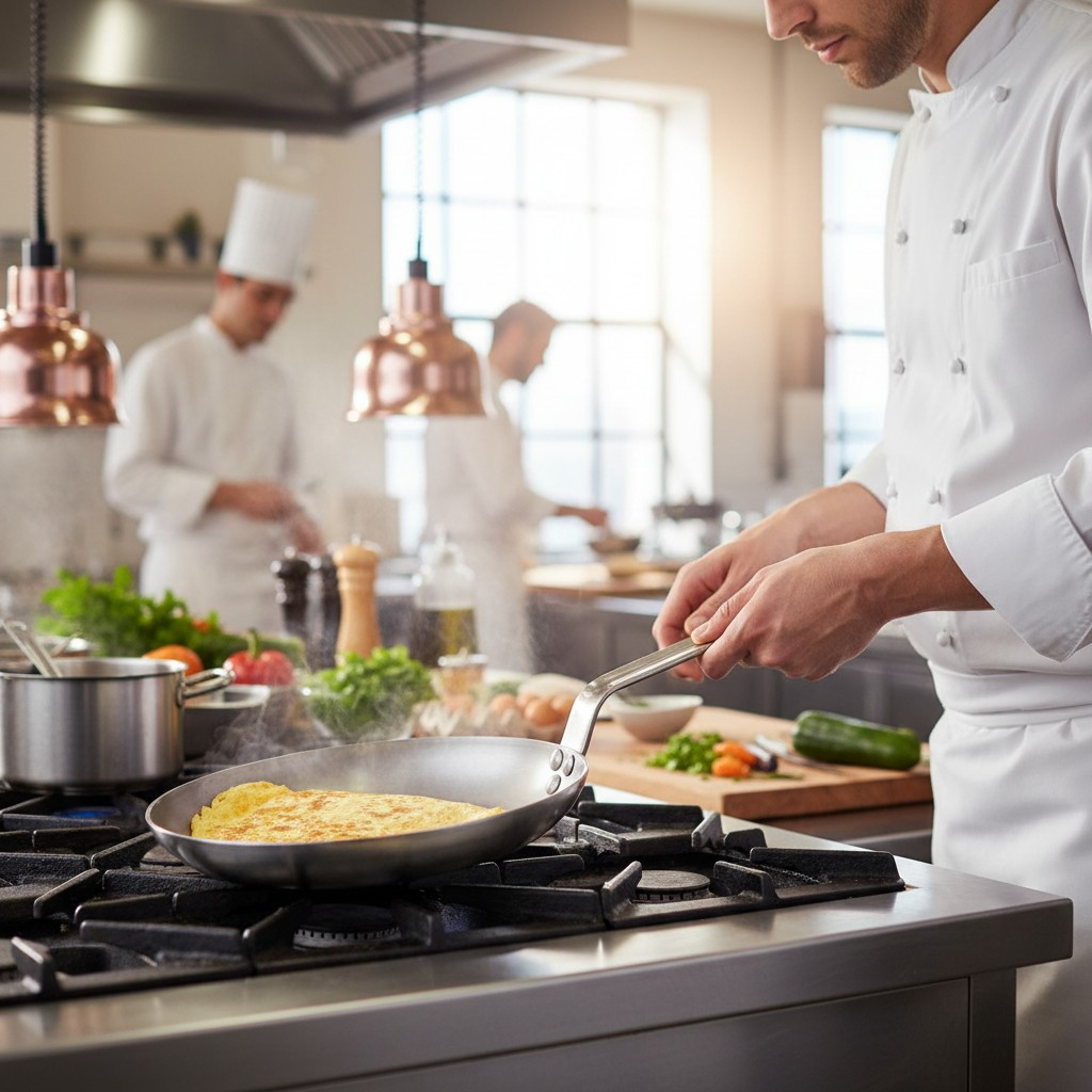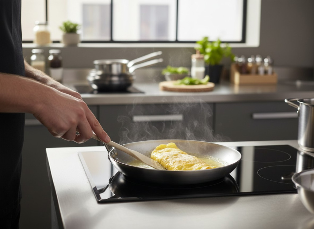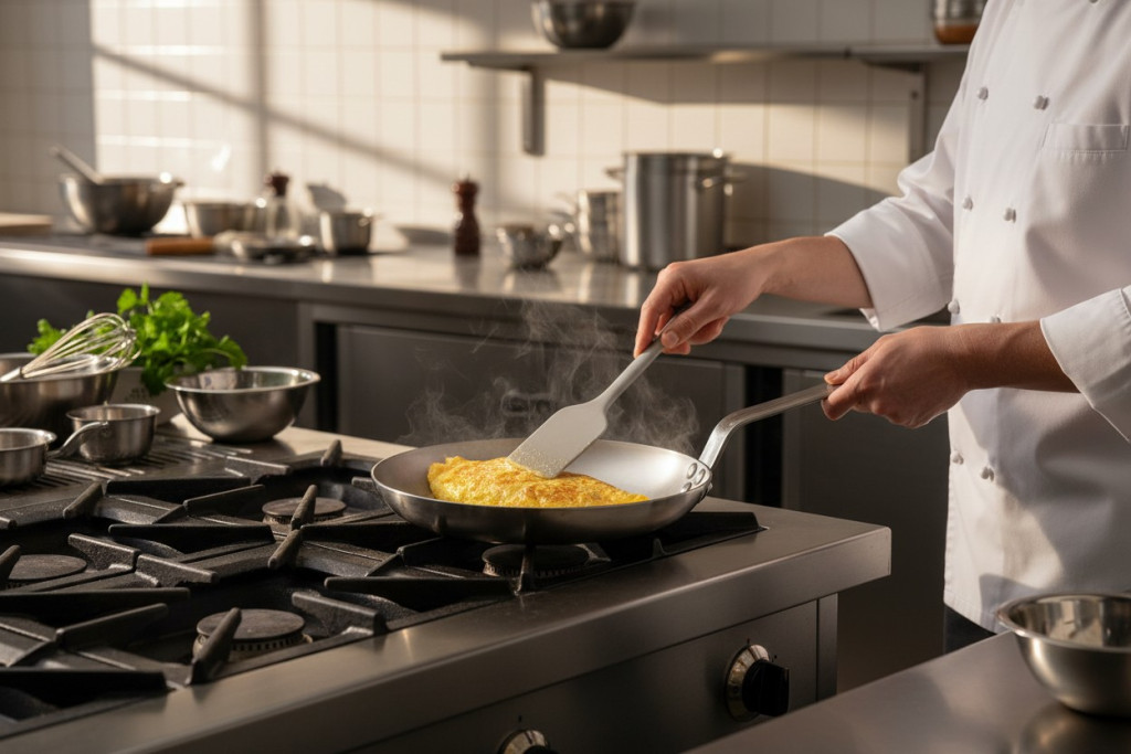 • Lapos kialakítás: A lapos kialakítás megkönnyíti az ételek megfordítását és kivételét a serpenyőből. Ideális omlettek, tükörtojások, palacsinták és más tojásételek készítéséhez.