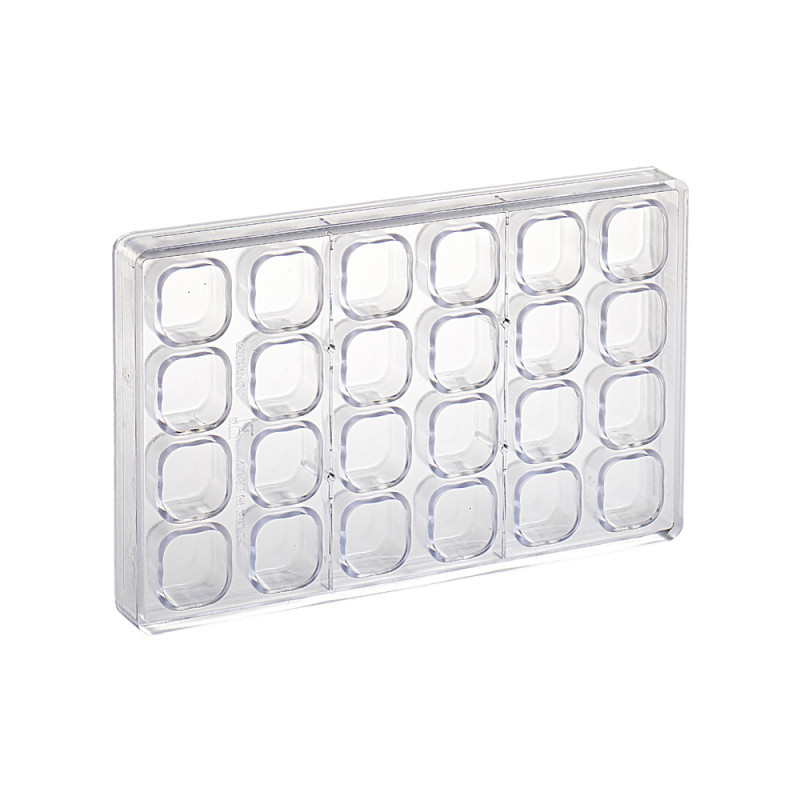 Ez a tetszés szerint tölthető csokoládéforma a ChocoFill vonalból ideális eszköz pralinék, mignonok és más töltött csokoládé édességek készítéséhez. A kiváló minőségű polikarbonátból készült forma 24 darab, egyenként 33x31 mm alapterületű és 20 mm magas mélyedést tartalmaz, amelyekbe tetszés szerinti töltelékeket helyezhetünk. A 275x175x26 mm-es forma praktikus méretű, könnyen kezelhető és tárolható. A késztermékek súlya körülbelül 10 gramm.