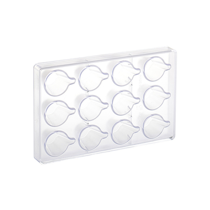 - Kiváló minőségű polikarbonát: A polikarbonát rendkívül tartós, ütésálló és hőálló anyag, amely garantálja a forma hosszú élettartamát. Sima felülete biztosítja a csokoládé fényességét és a könnyű kifordítást.